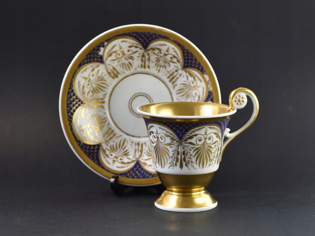 Forma filiżanki w stylu empire osadzna na stopce oraz zakończona wywiniętym ponad filiżankę uszkiem w typie wolutowym.