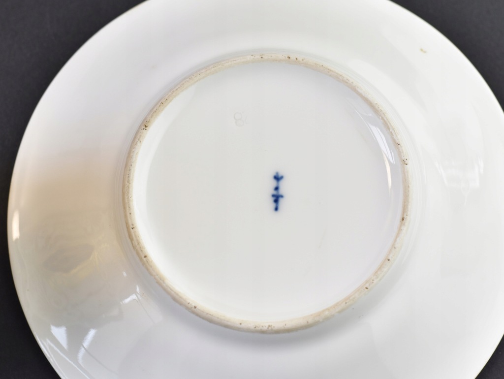 Stan: bardzo dobry z małymi, wiekowymi śladami użytkowania / przetarciami złoceń i minimalnymi śladami z produkcji; małe odpryski farby na spodku; porcelana bez uszkodzeń.
