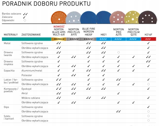 Nowe, ceramiczne ziarno Norton SG® połączone z obrabianym termicznie ziarnem elektrokorundu • Nowy, wyjątkowy, wzmocniony włóknami, niebieski papier lateksowy • Brak pigmentu w powłoce No-Fil® i spoiwie • Wyższe i szybsze tempo szlifowania • Idealny do dużych powierzchni • Łączy w sobie elastyczność i wytrzymałość na rozdarcie • Odporny na zabijanie się podczas pracy • Brak ryzyka przeniesienia koloru • Dłuższy okres użytkowania