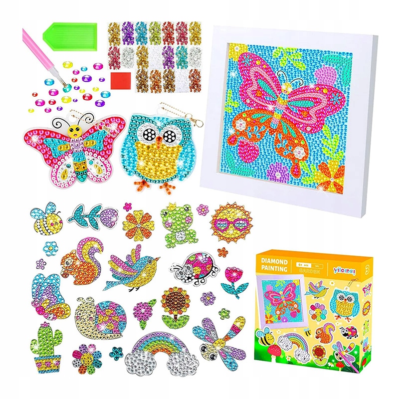 Zawartość opakowania : ramka, płótno z szablonem obrazka, naklejki, 2 łańcuszki, 2 zapięcia , diamenciki, klej, pojemnik, aplikator