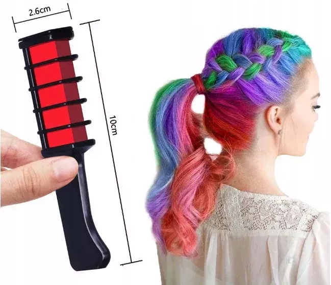 Grzebień z kredą farbującą to idealne rozwiązanie. Kreda rozpuszcza się w wodzie przez co łatwo się zmywa . Niezwykłe kolory dodadzą Ci super wyglądu czy to na wyjście czy na co dzień!