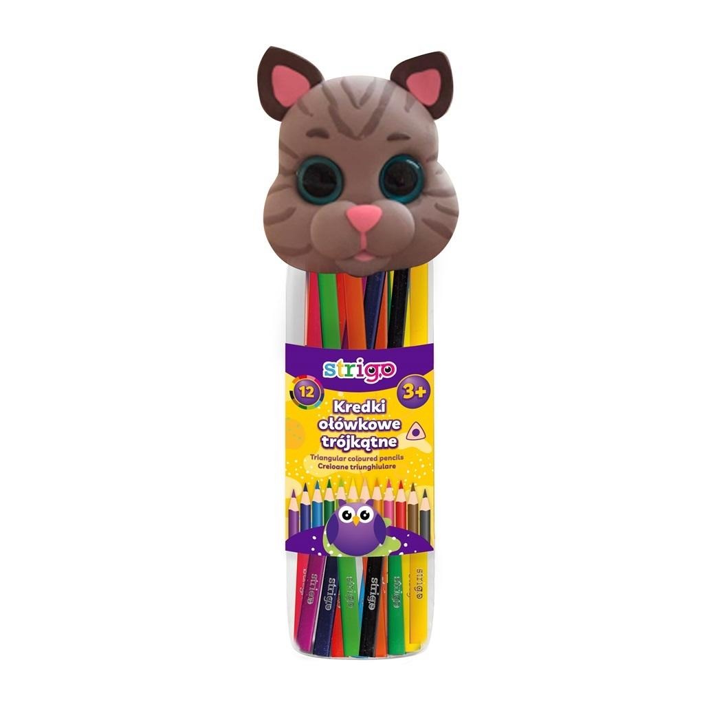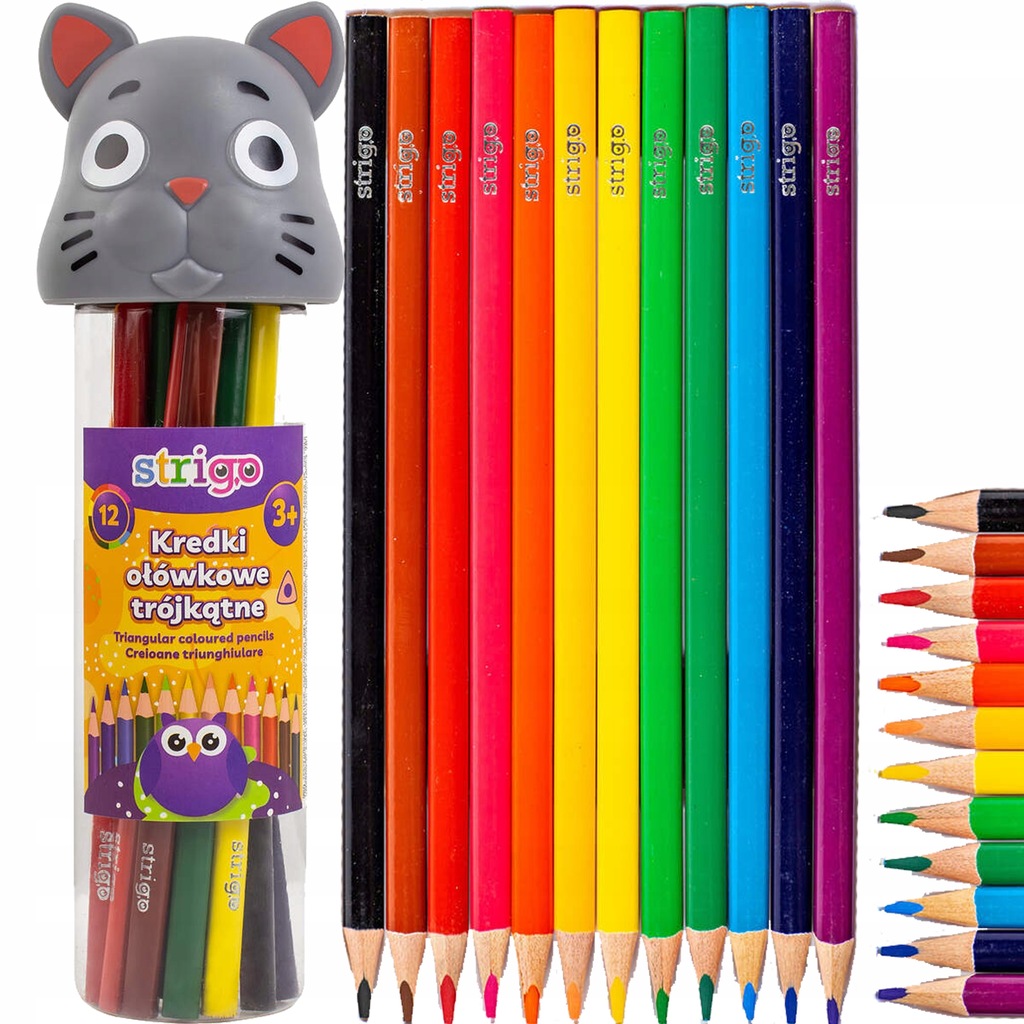 STRIGO KREDKI SZKOLNE OŁÓWKOWE TRÓJKĄTNE 12 kolorów w Etui KOTEK
