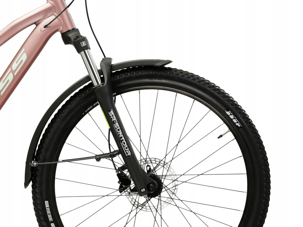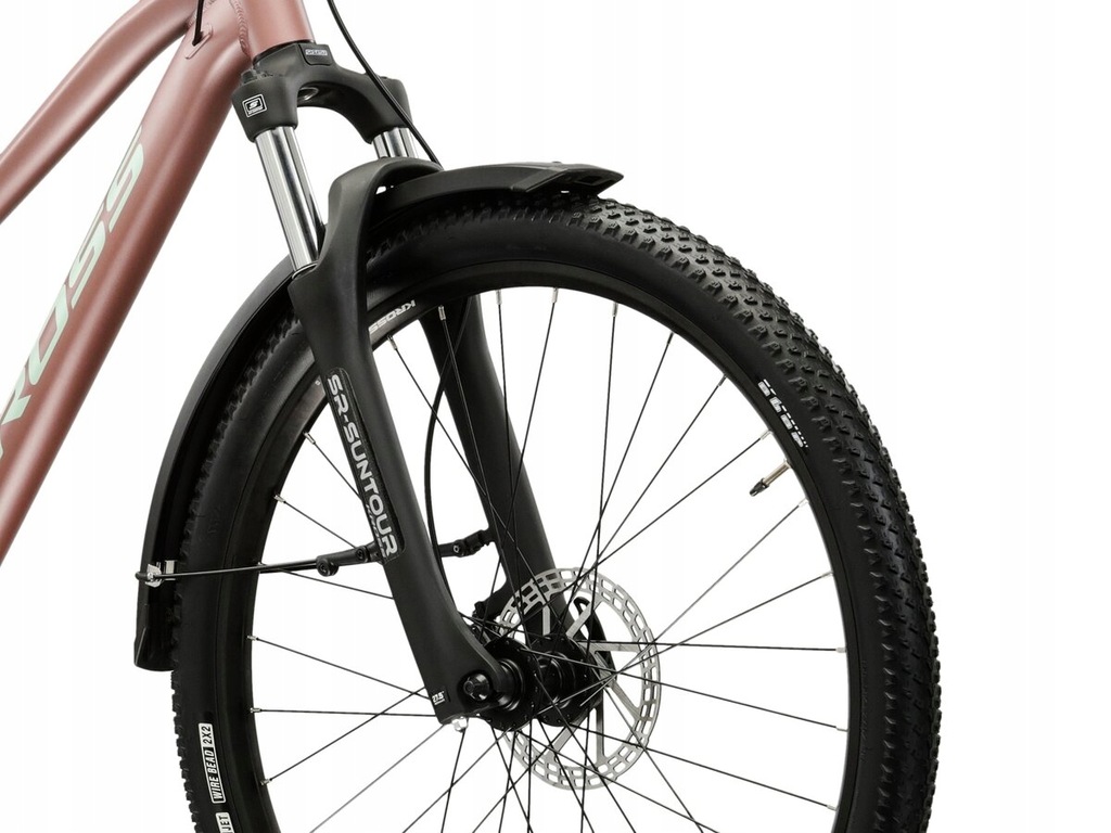 Amortyzowany widelec SR Suntour ze skokiem 100 mm zapewnia wysoką kulturę pracy oraz doskonałe tłumienie wibracji powstających podczas jazdy po nierównej i wyboistej nawierzchni.