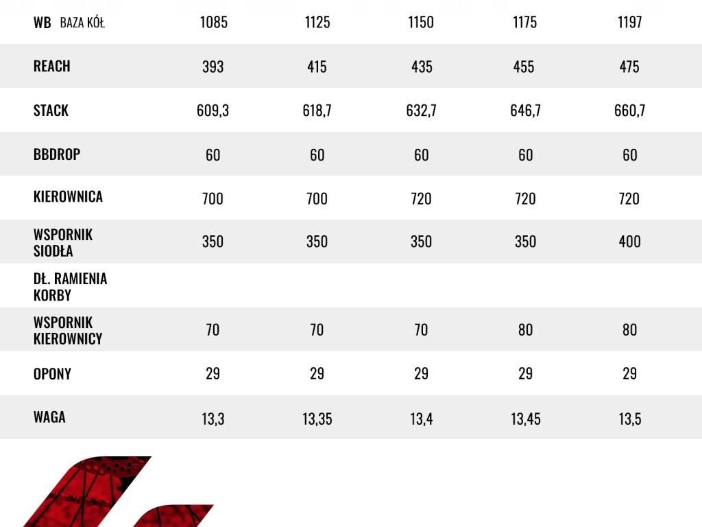 - WAGA [KG]: S - 13,3 KG, M - 13,35 KG, L - 13,4 KG, XL - 13,45 KG, XXL - 13,5 KG