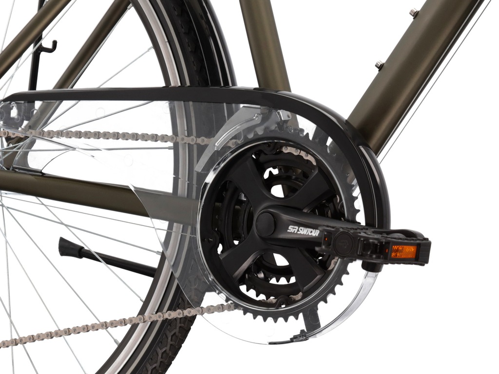W KROSS Trans 2.0 SR zamontowaliśmy hamulce V-brake, które zapewnią ci dużą siłę hamowania na asfalcie jak i na leśnej ścieżce. Opony o szerokości 42 milimetry pozwalają na stosowanie go w prawie każdych warunkach atmosferycznych i długą eksploatację. Ponadto wyposażony jest on w wysokiej jakości grupę napędową Sunrace oferującą aż 21 przełożeń. Ułatwią one pokonywanie stromych wzniesień oraz rozwinięcie wysokiej prędkości na płaskich odcinkach drogi. Tylna przerzutka Sunrace RDM41 zapewnia szybką i precyzyjną zmianę przełożeń. Za jej poprawną pracę odpowiada manetka Sunrace DLM403, której pracę docenisz kiedy teren po którym jedziesz zacznie piąć się w górę. Jeden ruch i Twój łańcuch jest na odpowiednim trybie.