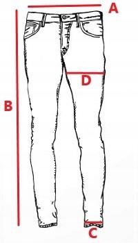 32: A- szerokość pas 43 cm B- Długość nogawki 57 cm C- szerokość dołu nogawki 23 cm D- szerokość udo 27 cm