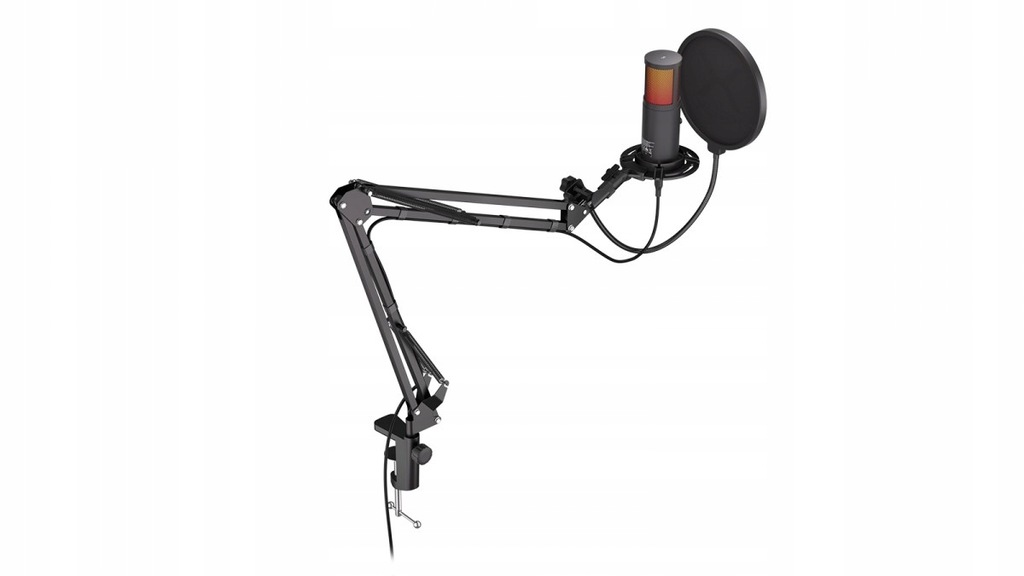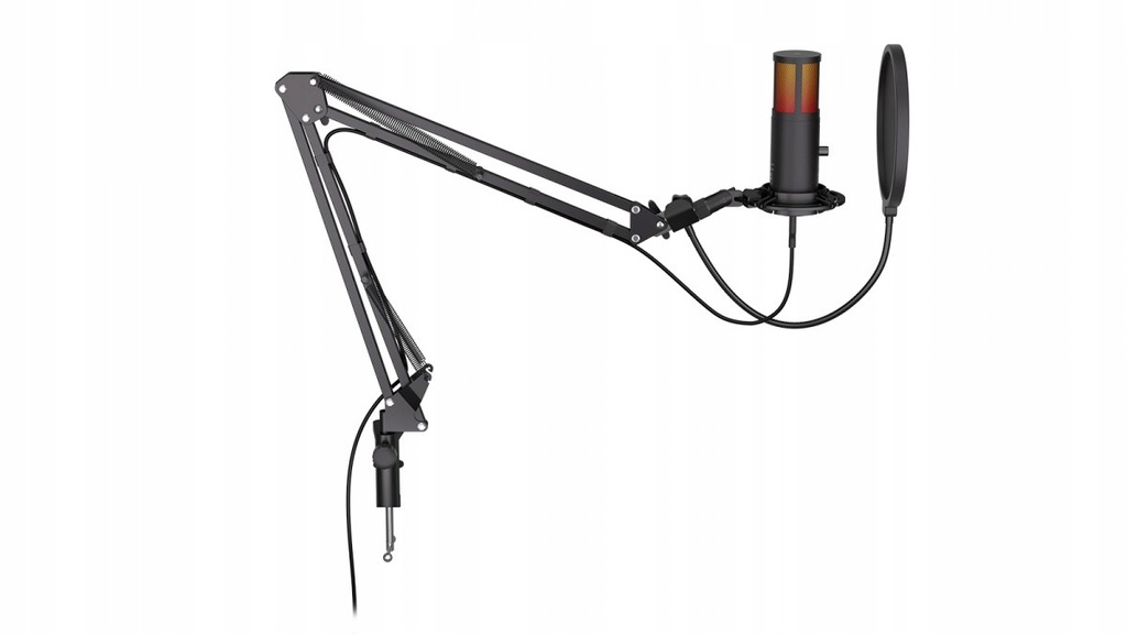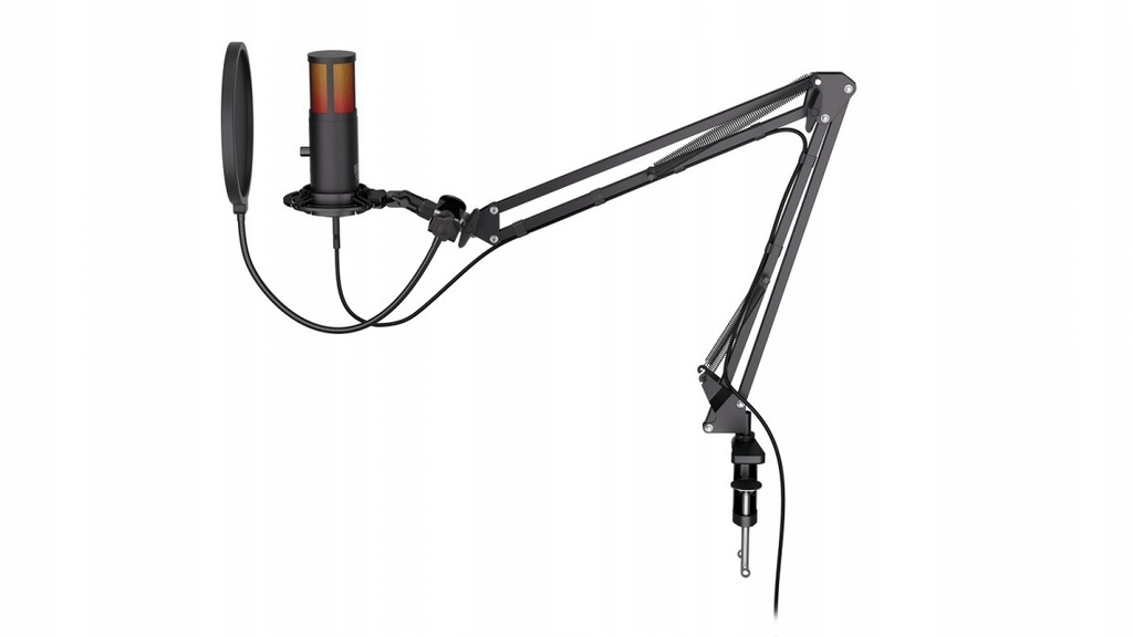 - Wymiary: 1× Regulowane ramię mikrofonowe z podstawą 1× Kosz antywstrząsowy 2× Filtr ochronny (przykręcany pop filtr oraz filtr z pianki) 1× Przewód USB-C 1× Zestaw rzepów montażowych 1× Silikonowy organizer przewodu 1× Instrukcja obsługi