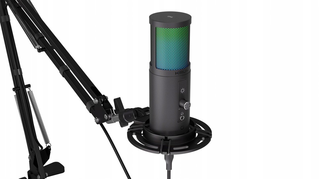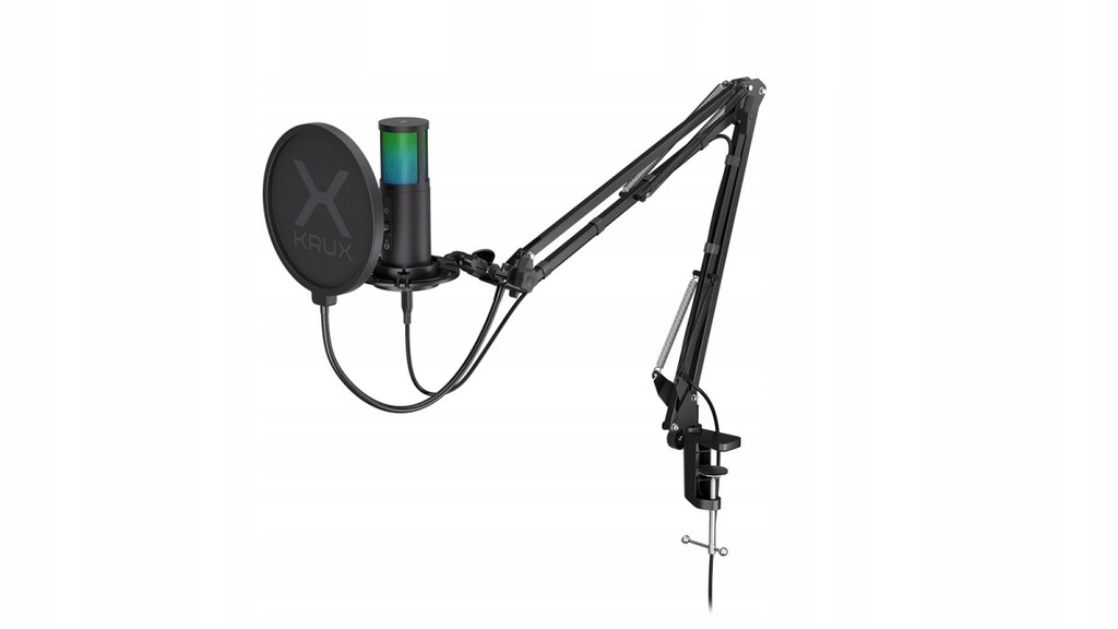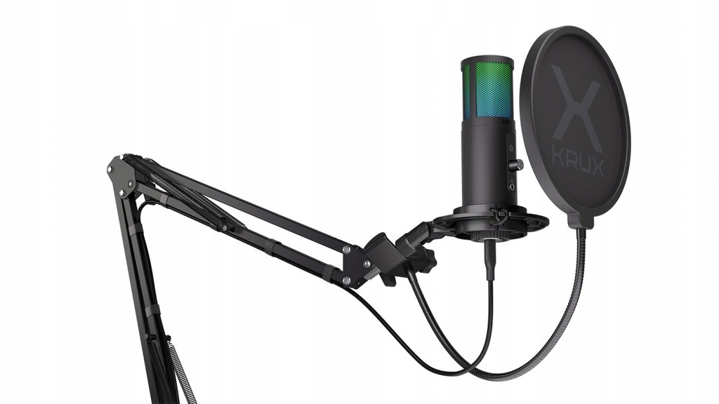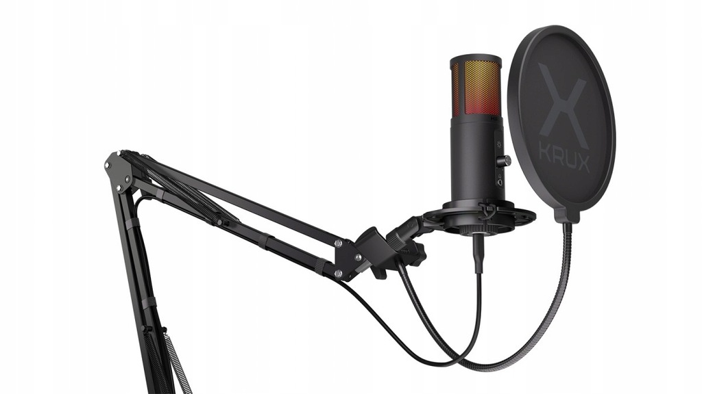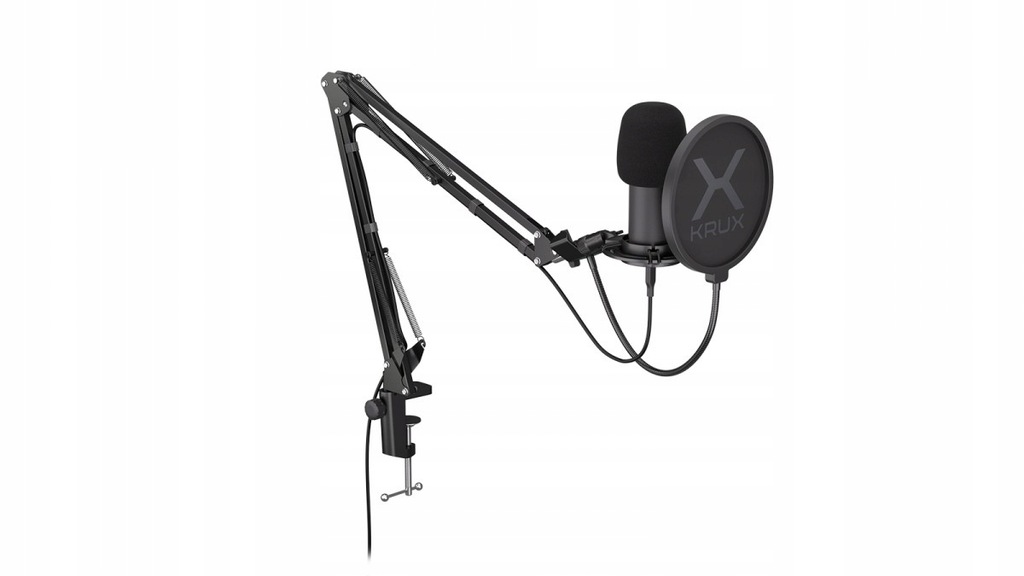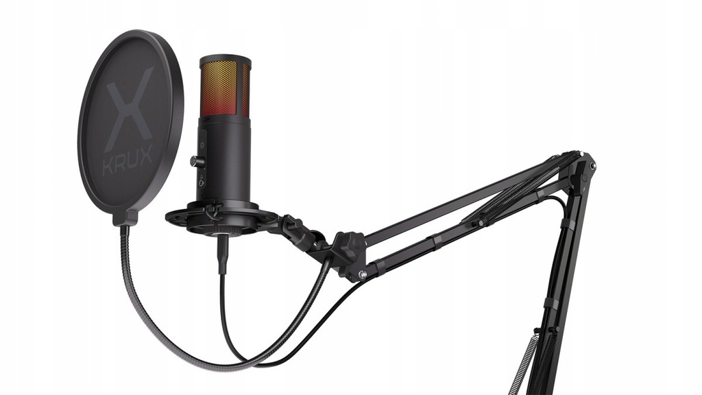 Niezbędnym elementem każdego szanującego się mikrofonu jest pop filtr, który wyeliminuje z nagrania nieprzyjemne głoski wybuchowe (takie jak B, P, T etc.). My (jak to Krux ma w zwyczaju) dorzucamy nie jeden, a dwa pierwszy dokręcany do ramienia, a drugi w formie gąbki na mikrofon. Koledzy Ci podziękują. Oprócz tego, w zestawie jest koszyk antywstrząsowy, aby pozbyć się niepotrzebnych wibracji przenoszonych przez Twoje biurko.