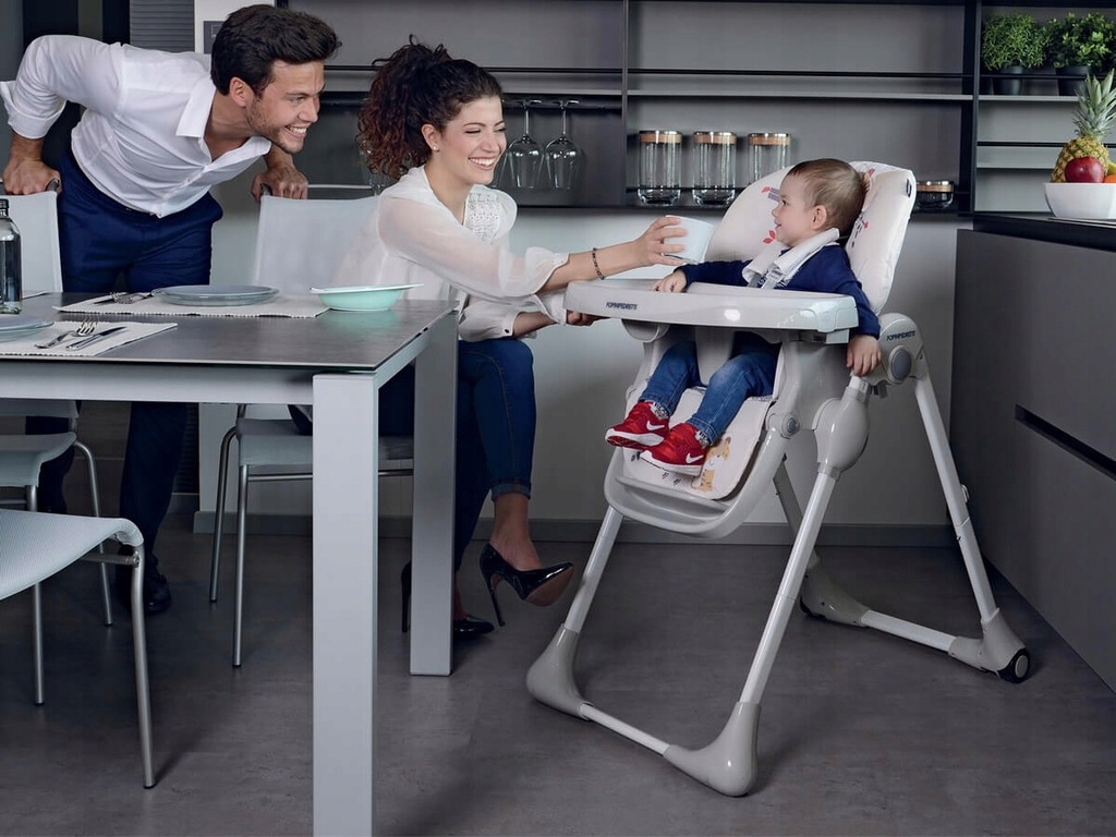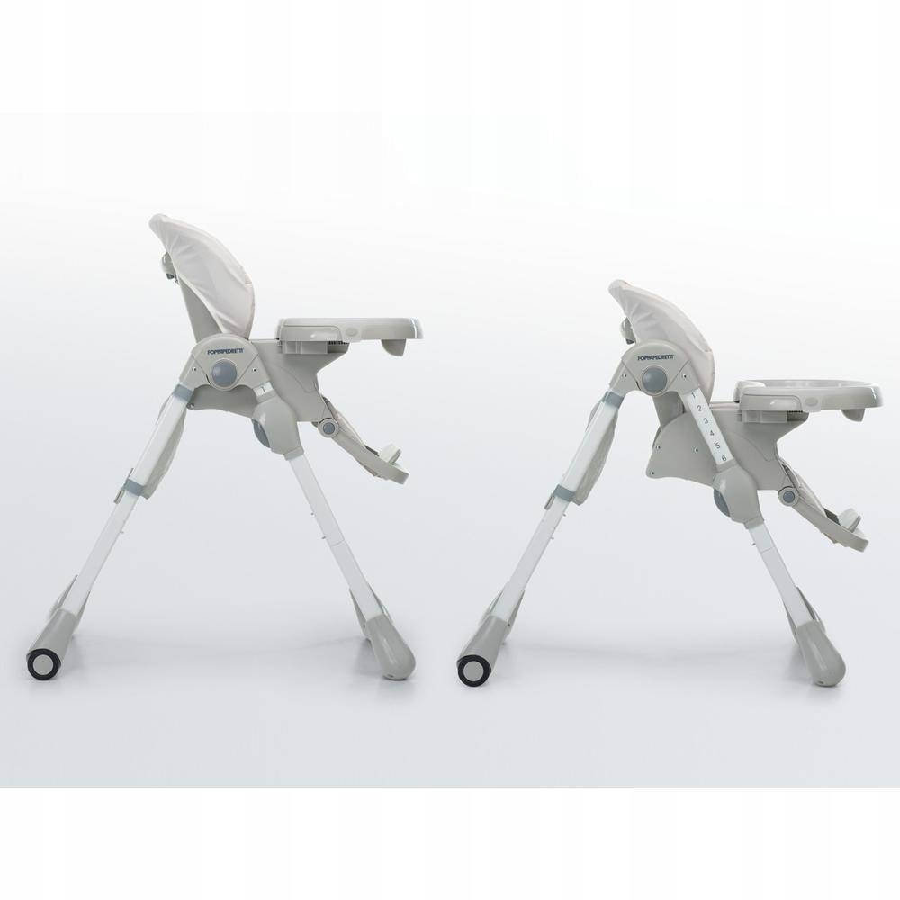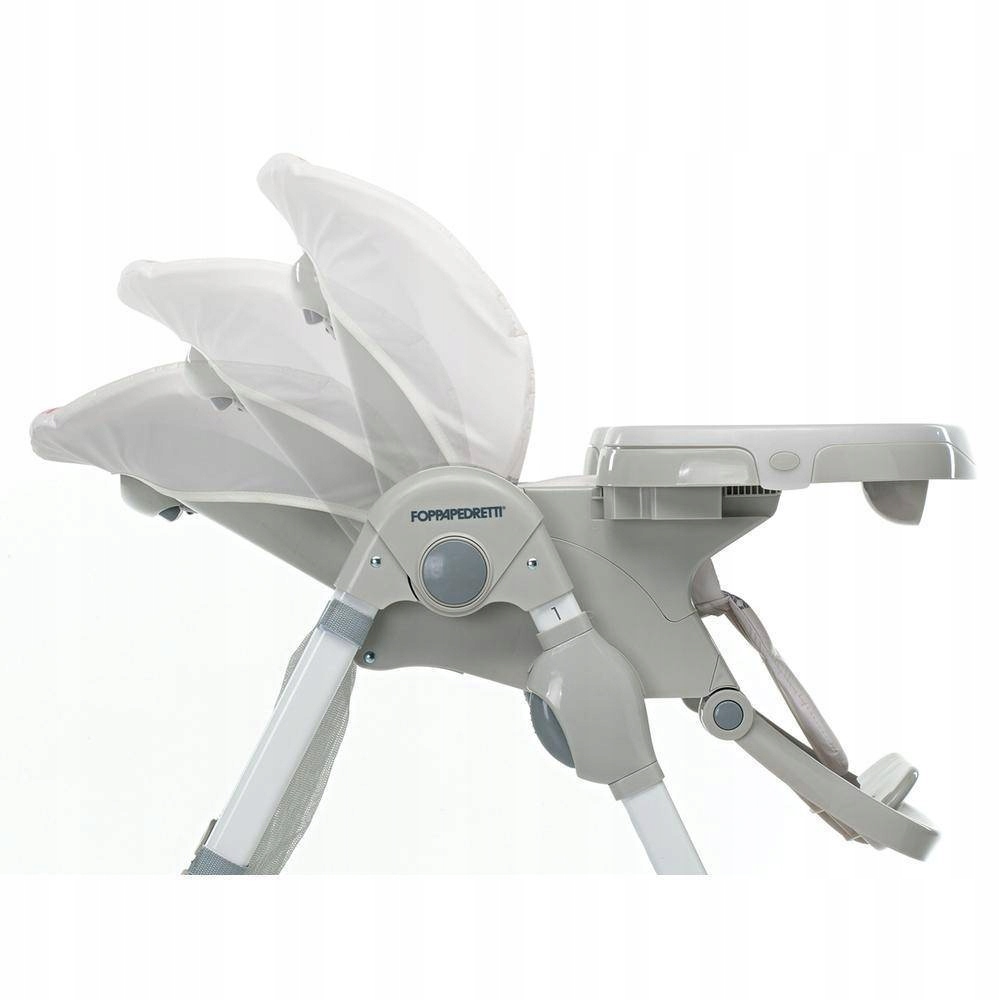 Krzesełko do karmienia Foppapedretti - wielofunkcyjne regulowanie wysokości, natomiast podnóżek i taca krzesełka może zająć trzy różne pozycje. Krzesełko posiada również pięciopunktowe pasy bezpieczeństwa.