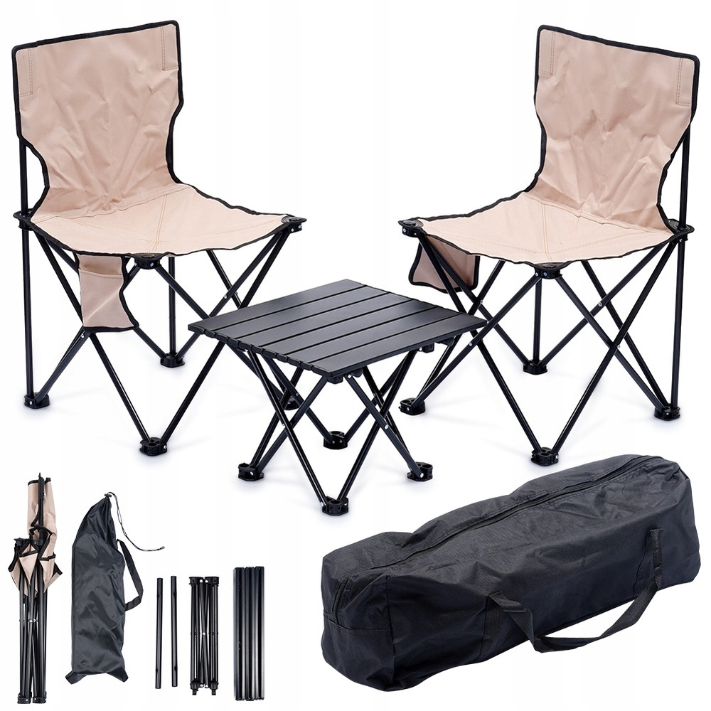 Zestaw turystyczny składający się z dwóch krzeseł oraz stolika. Po złożeniu nie zajmuje dużo miejsca i jest pakowany w praktyczną torbę.