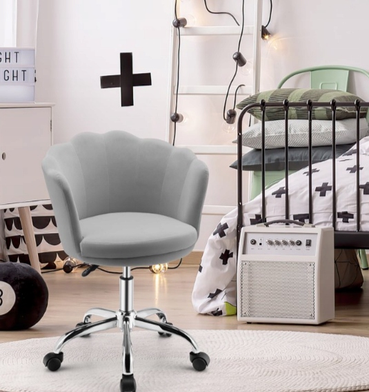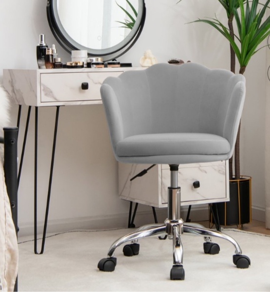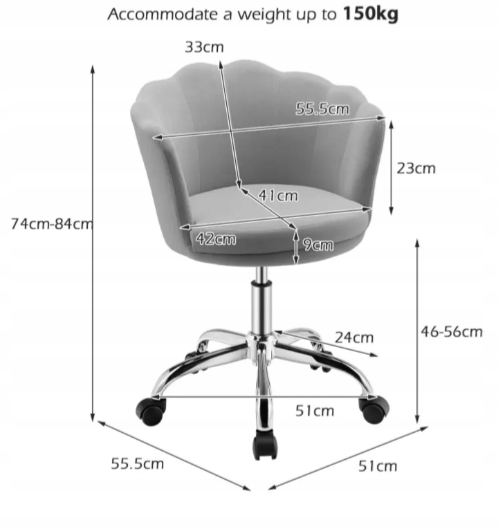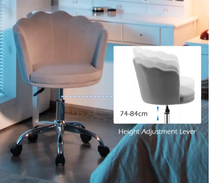 Wyściełana poduszka i oparcie są owinięte gąbkami o dużej gęstości i przyjaznym dla skóry aksamitem. Ponadto podłokietniki są połączone ze środkowym oparciem w jednym kawałku, aby uzyskać wsparcie dookoła. Jeśli chodzi o stabilność, krzesło wypoczynkowe jest wyposażone w metalową podstawę z 5 pazurami, aby zwiększyć całkowitą nośność do 150 kg. Regulowana wysokość (74 cm-84 cm) umożliwia wygodniejsze korzystanie z toaletki osobom o różnym wzroście. Wraz z obracającym się o 360 stopni siedziskiem i 5 gładko obracającymi się nylonowymi kółkami, akcentujące krzesło do domowego biura przenosi elastyczność użytkowania na wyższy poziom. Co więcej, te elastyczne funkcje umożliwiają również wszechstronne zastosowania. Krzesło biurowe można również przekształcić w krzesło do makijażu, krzesło do nauki dla dzieci itp.