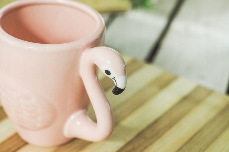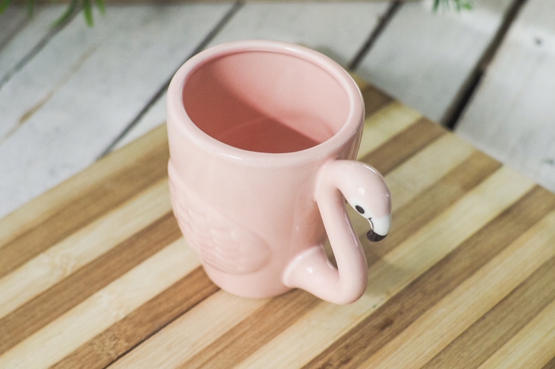 Uroczy kubek z uchwytem w kształcie głowy flaminga oraz wzorem skrzydeł na korpusie kubka.