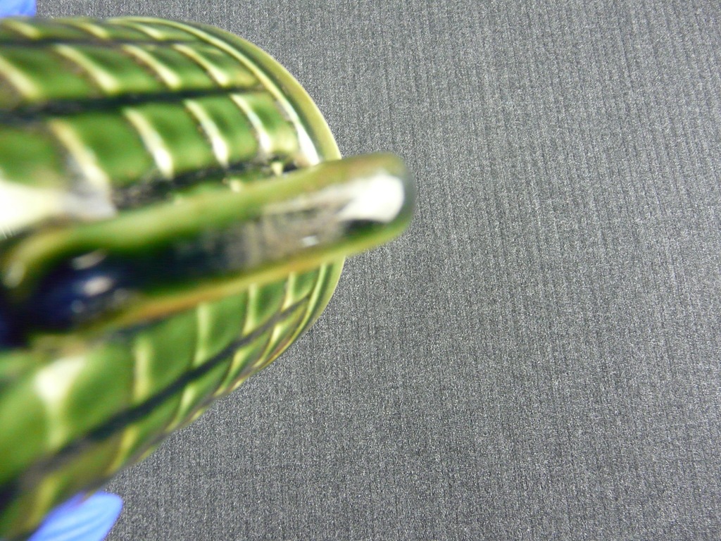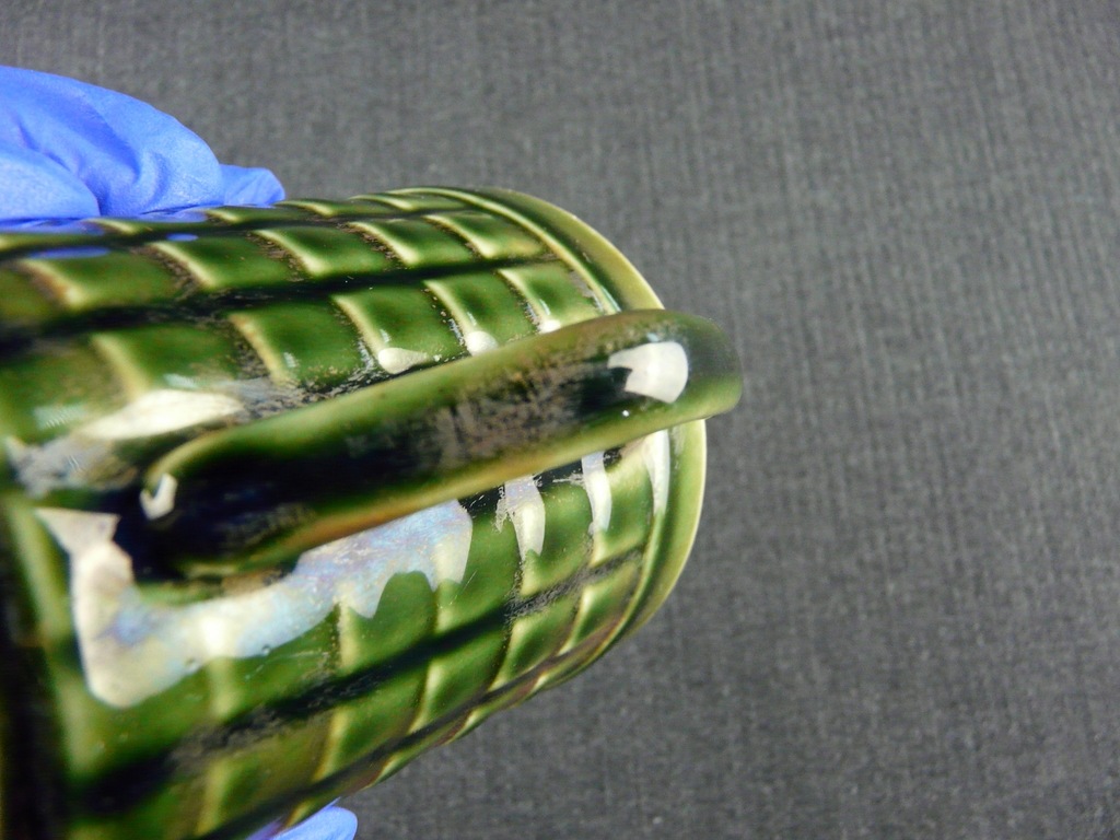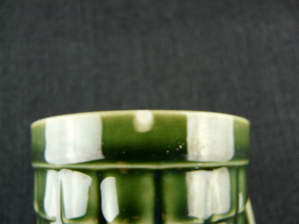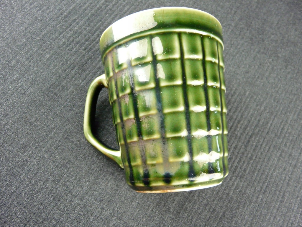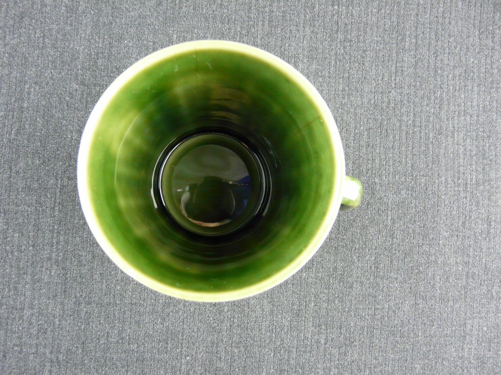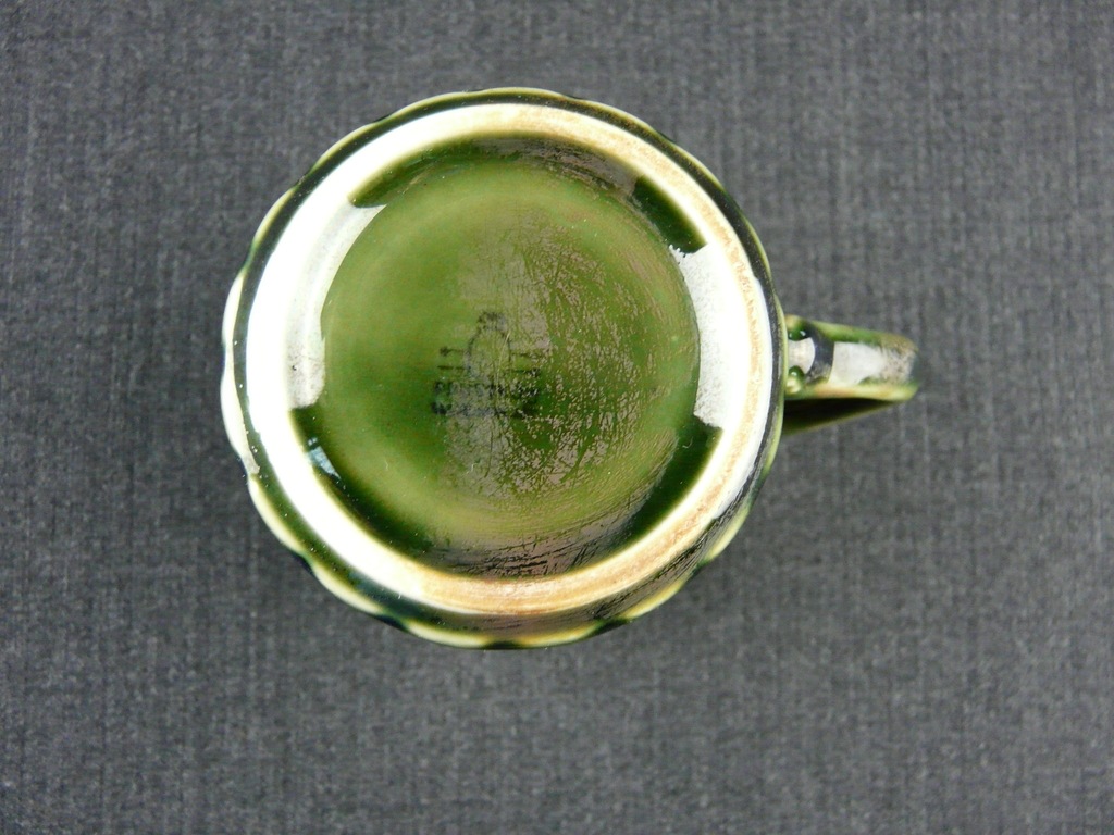 używany, przy górnej krawędzi małe wyszczerbienie widoczne na zdjęciach, poza tym na uchu i w jego okolicach z boku przebarwienia na szkliwie. Nie wiem czy to jest jakiś nalot, czy wada produkcyjna. Na dnie kubka widoczne są zarysowania szkliwa.