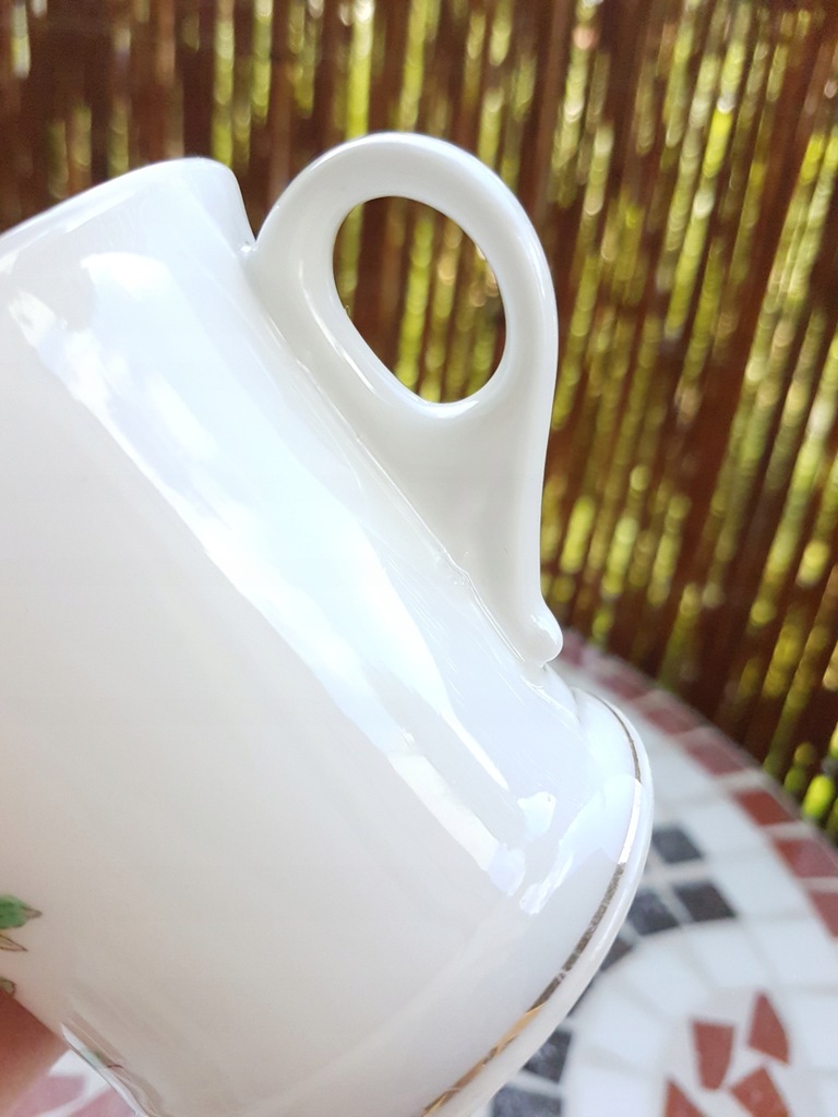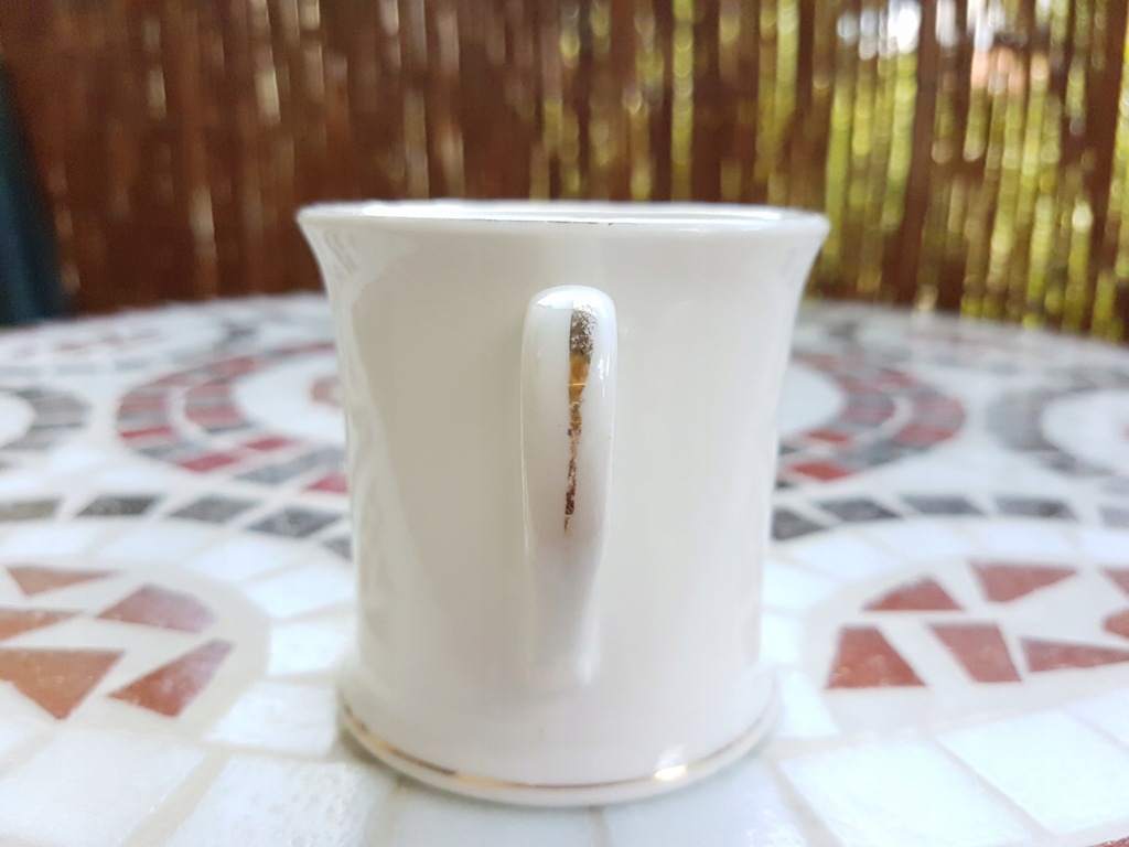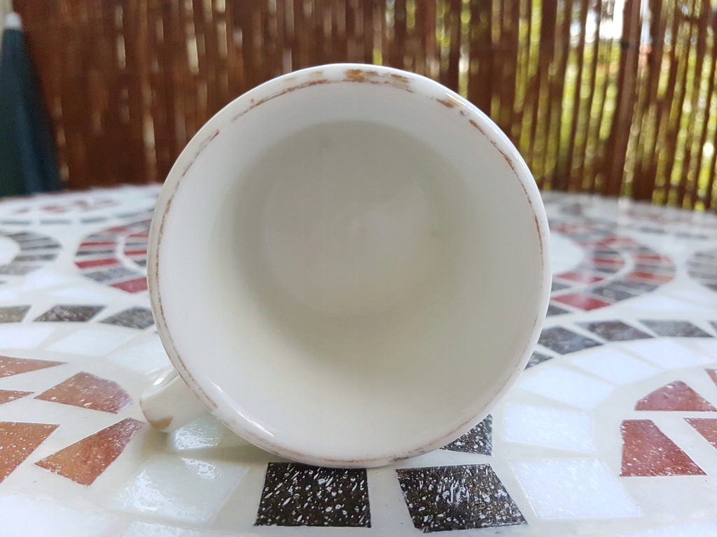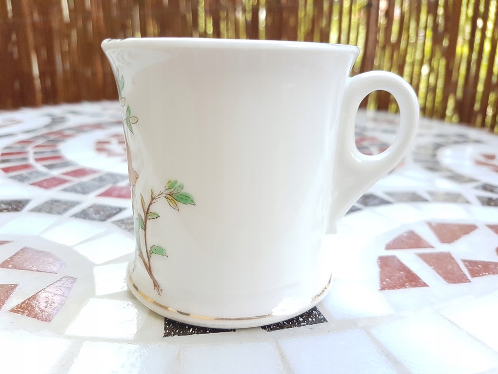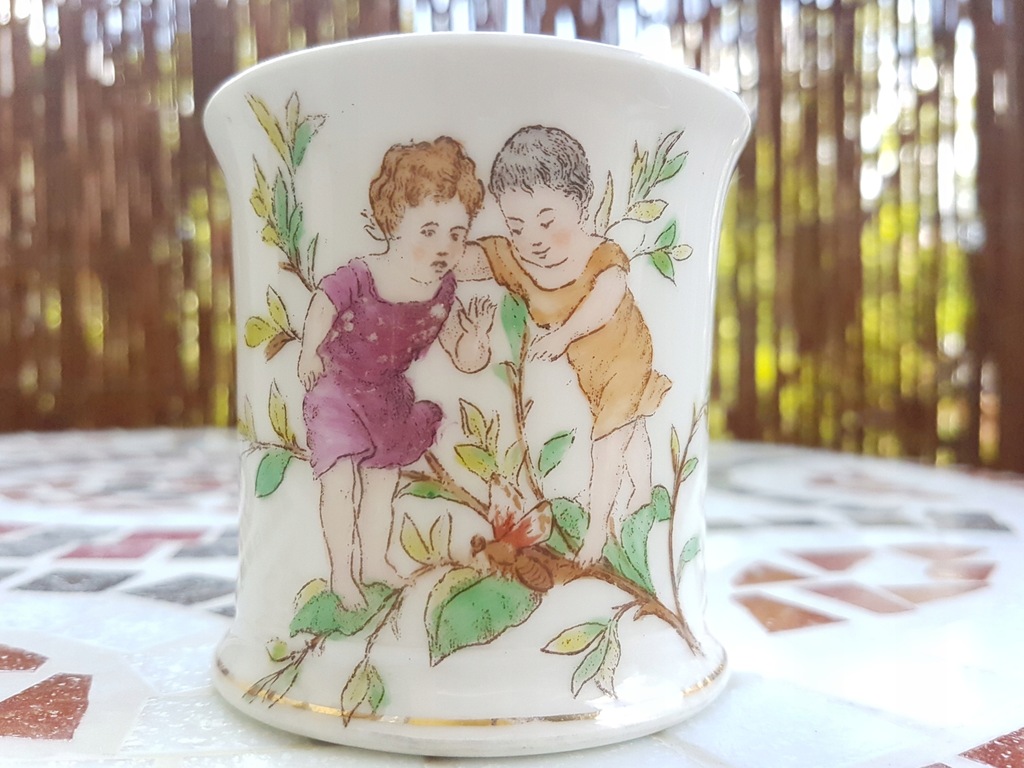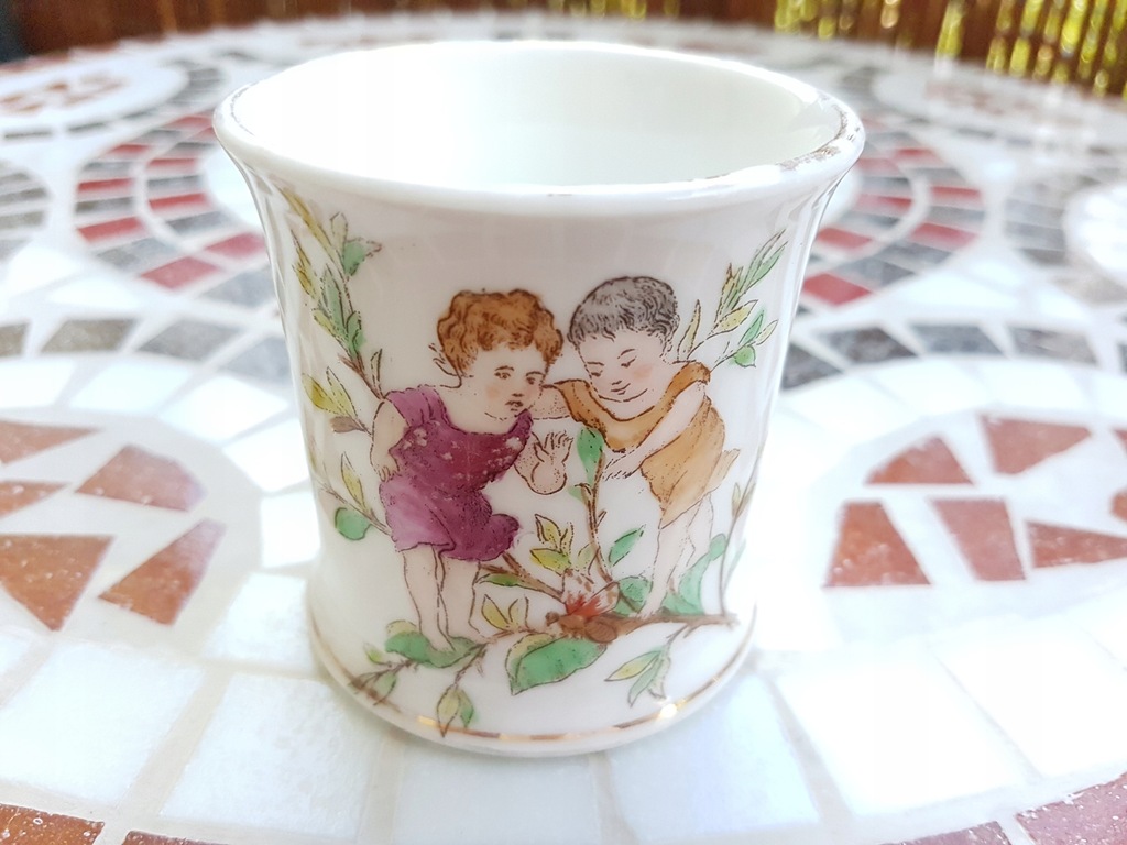 Porcelana z manufaktury Carla Tielscha z dawnego Starego Zdroju. Nieduży kubek dekorowany motywem dzieci, które wspięły się na gałęzie drzewa i przyglądają się siedzącej tam ważce (?)