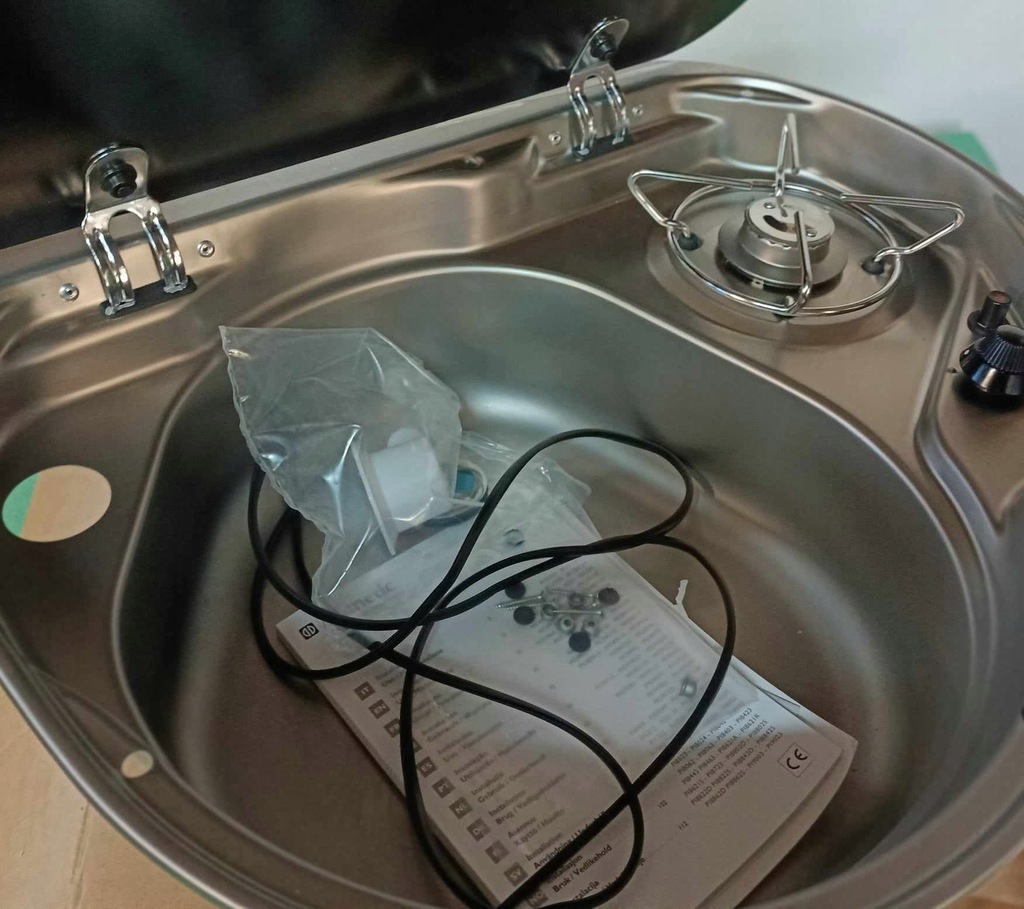 Kompaktowe połączenie kuchenki i zlewozmywaka. Zlewozmywak po lewej stronie.