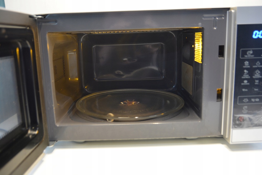 Kuchenka mikrofalowa SHARP YC-MG02E-S sterowana elektronicznie o pojemności 20 l, mocy mikrofali 800 W, grilem o mocy 1000 W, z 8 automatycznymi programami czasowego i wagowego rozmrażania.