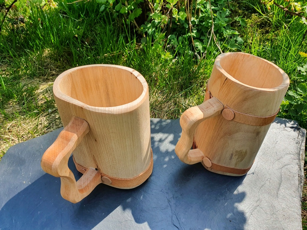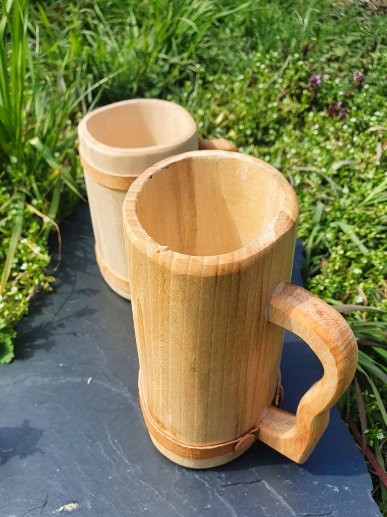 Uwaga: Kufle są robione ręcznie z naturalnych materiałów, dlatego rozmiary, kształty, kolorystyka jak i usłojenie mogą się różnić od tych na zdjęciu. Wykończone są jednym albo dwoma paskami ze skóry. Kufle wysyłamy losowo
