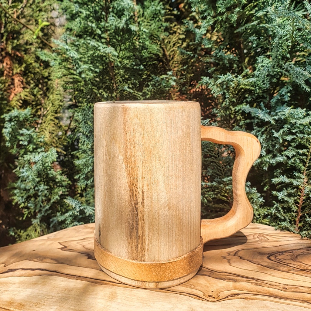 Na sprzedaż oferujemy kufel z drewna lipowego wykończonego jednym lub dwoma paskami ze skóry cielęcej. Kufle są wykonywane ręcznie, impregnowane z zewnątrz olejem roślinnym, środek jest woskowany.