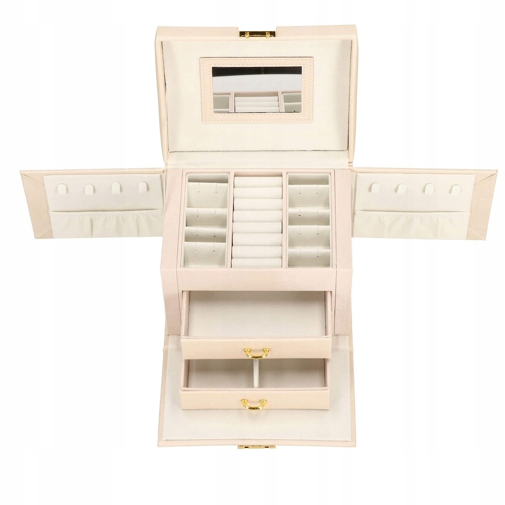 Pudełko posiada dodatkowe miejsce do przechowywania w dolnych szufladach. Dzięki temu możesz pomieścić w środku więcej biżuterii. Dodatkowo boczne ścianki kufra są otwierane znajdziemy tam haczyki do zawieszania wisiorków lub naszyjników.