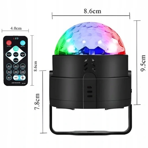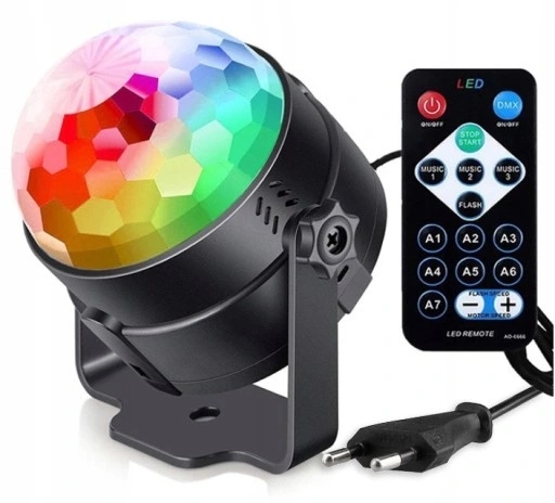 - Sterowanie kulą jest banalnie prosta. Pilot, który jest załączony w zestawie pozwala na kontrolowanie projektora bez konieczności ciągłego podchodzenia do niego w każdej chwili możesz zmienić efekt świetlny. Ułatwia to obsługę podczas gdy kula jest umieszczona w ciężko dostępnym miejscu np. Suficie