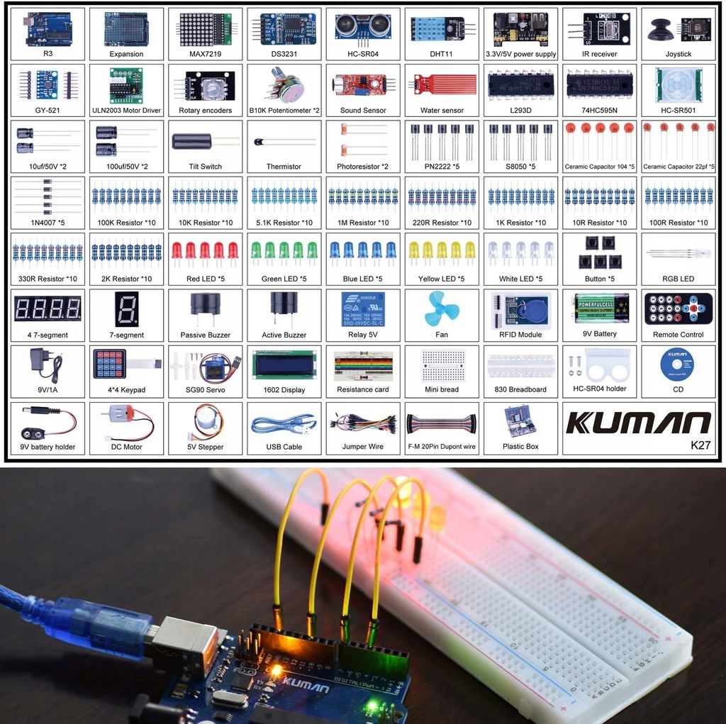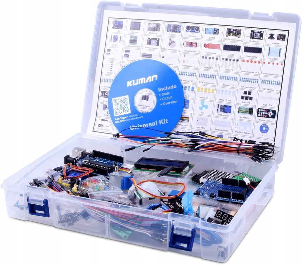- Najbardziej kompletny, największy i najbardziej ekonomiczny zestaw startowy z 66 rodzajami produktów programistycznych, ponad 200 sztuk komponentów. Płytka rozwojowa Human R3 i kabel USB są również dołączone i są w 100% kompatybilne z ArduinoIDE R3.