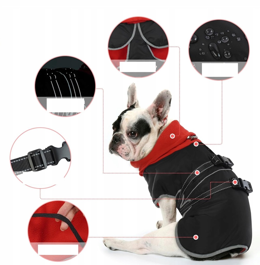 - Regulowana kurtka dla psów: Jak wszyscy wiemy, psy mają różne kształty i rozmiary. Aby dostosować urządzenie, opracowaliśmy regulowaną klamrę z tyłu, dzięki której można mieć, że kurtka będzie idealnym pasowaniem do psa. Konstrukcja sprężysta pasków w przypadku awaryjnego poluzowania się psa podczas jazdy.