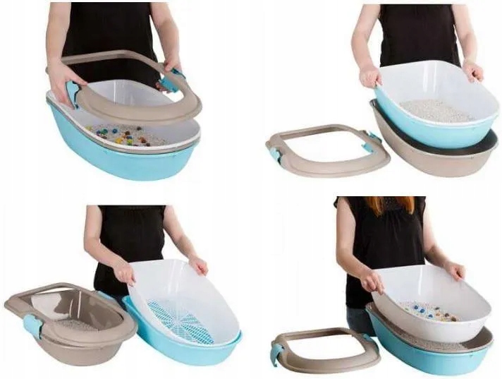 Innowacyjna kuweta przesiewowa z sitkiem i dwiema tackami, które oddzielają czysty żwirek od zużytego, eliminując potrzebę użycia łopatki.