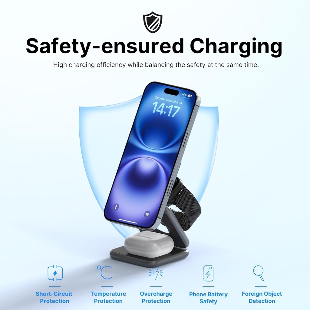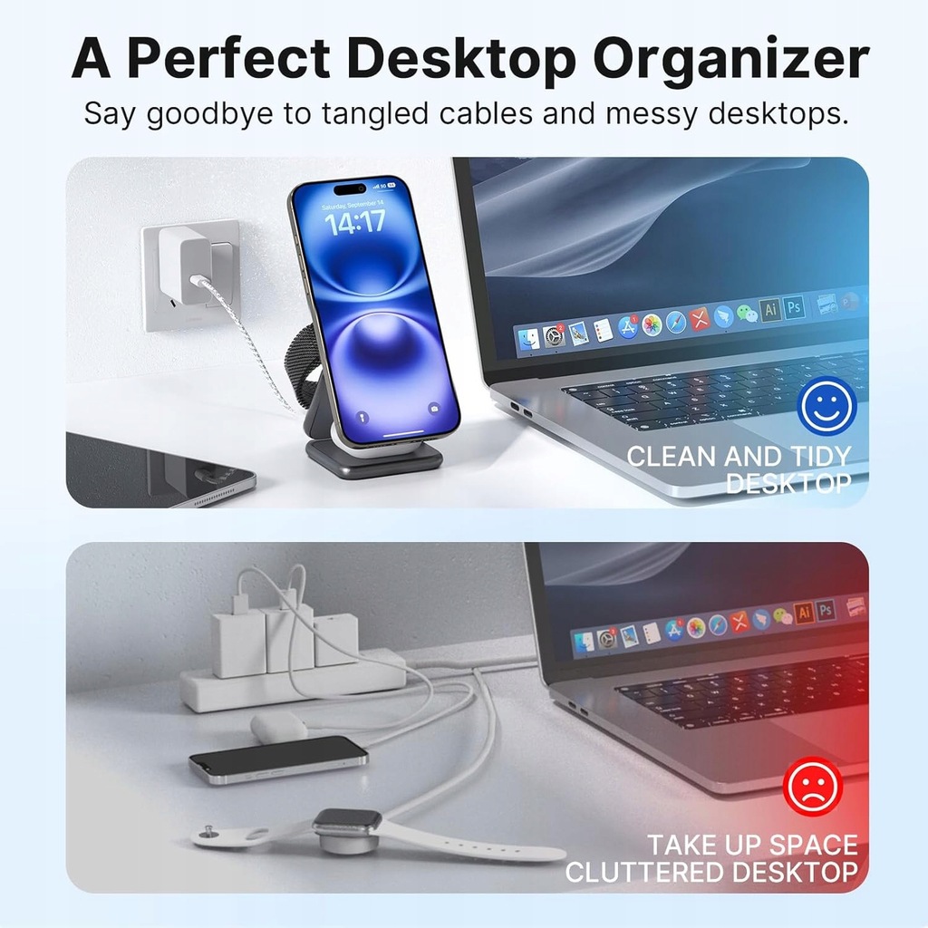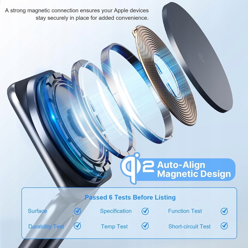 Nowa generacja ładowania bezprzewodowego: X40Q ładuje iPhone’a 16/15 Pro z mocą 5W zgodną z Qi2 – nawet 2x szybciej niż standardowe ładowarki 7.5W. Równoczesne ładowanie Apple Watch i AirPods sprawia, że to stacja ładująca 3w1, której szukałeś.