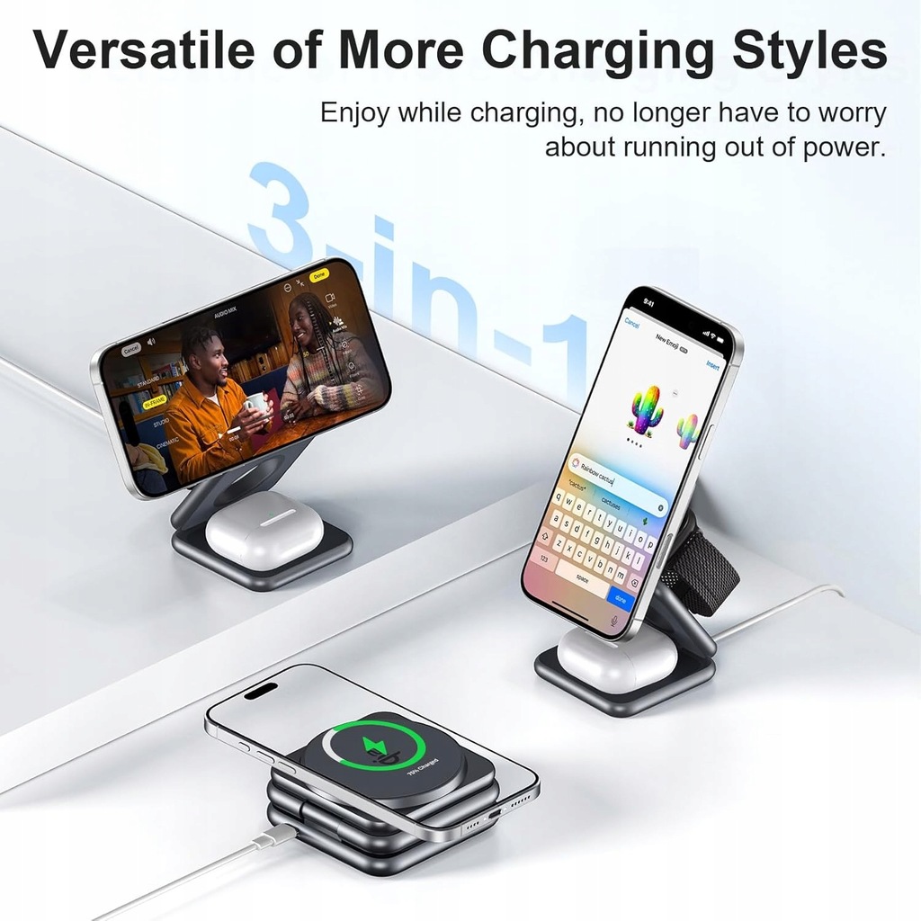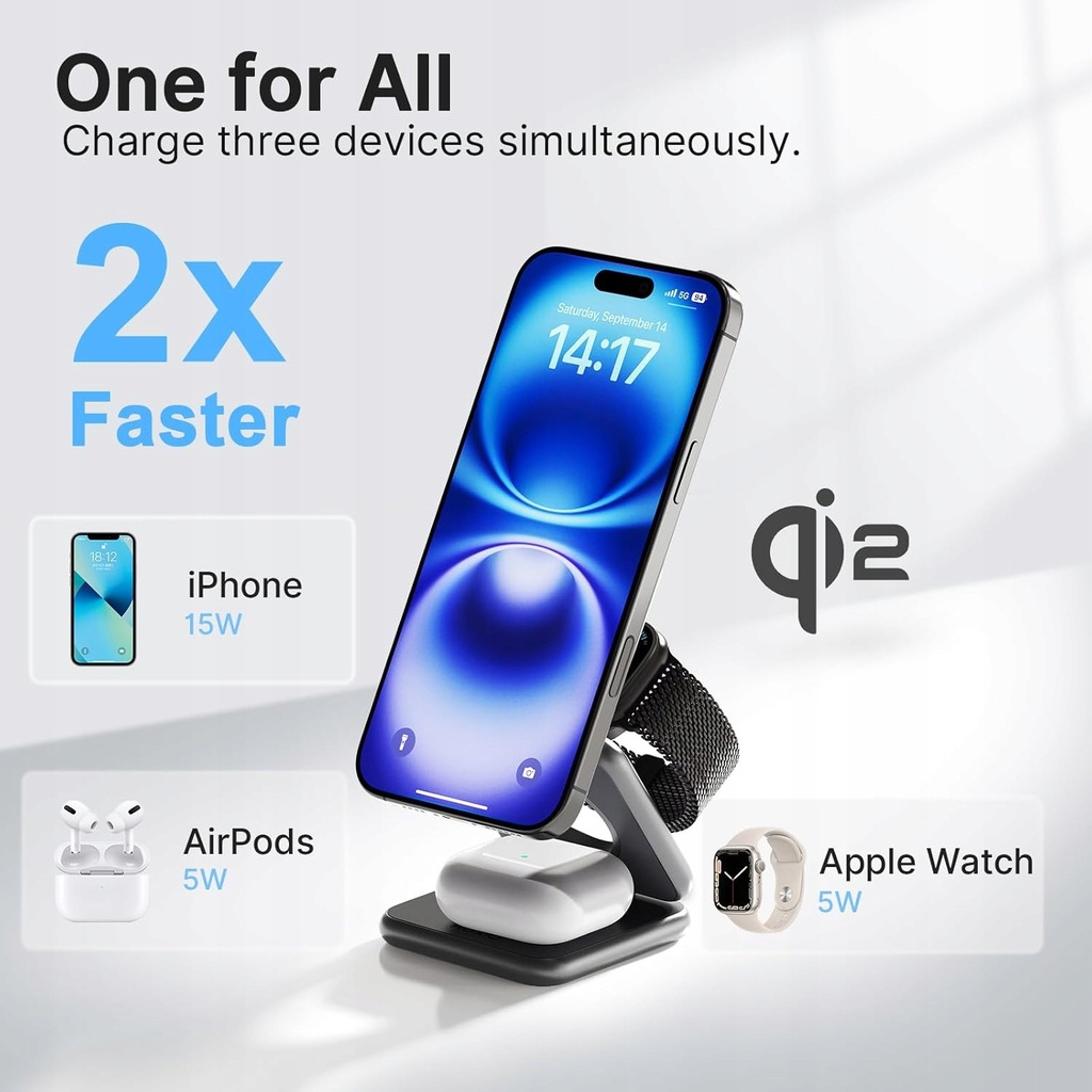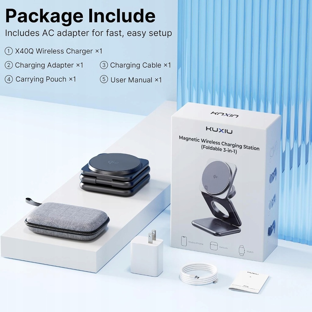 KuXIU X40Q Składana Ładowarka Qi2 MagSafe 3w1 – Egzemplarz Wystawowy | Szybkie Ładowanie 5W | Szara