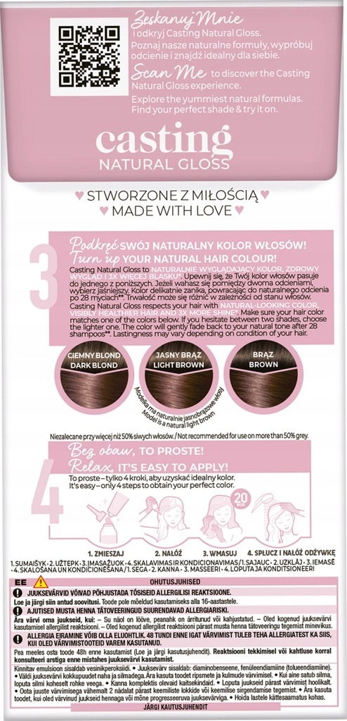 Casting Natural Gloss krem koloryzujący to odżywcza koloryzacja z formułą zawierającą 90% naturalnych składników, która optymalnie pokrywa siwe włosy, odżywia i wygładza, zapewniając włosom zdrowy wygląd i wyjątkowy blask.
