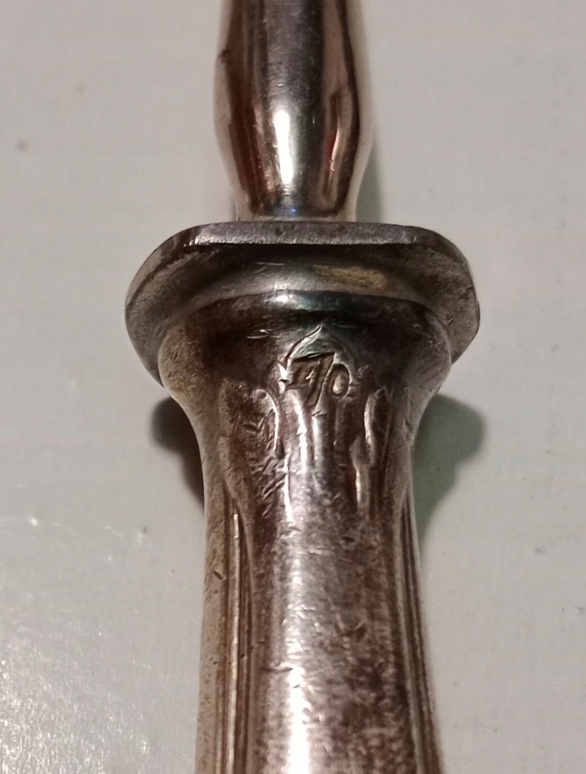 Oferuję 1 sztukę posrebrzanego zabytkowego nożyka do pasztetu/masła firmy niemieckiej. Stan jak na zdjęciach, wymaga jedynie polerowania. Długość 18,5 cm.