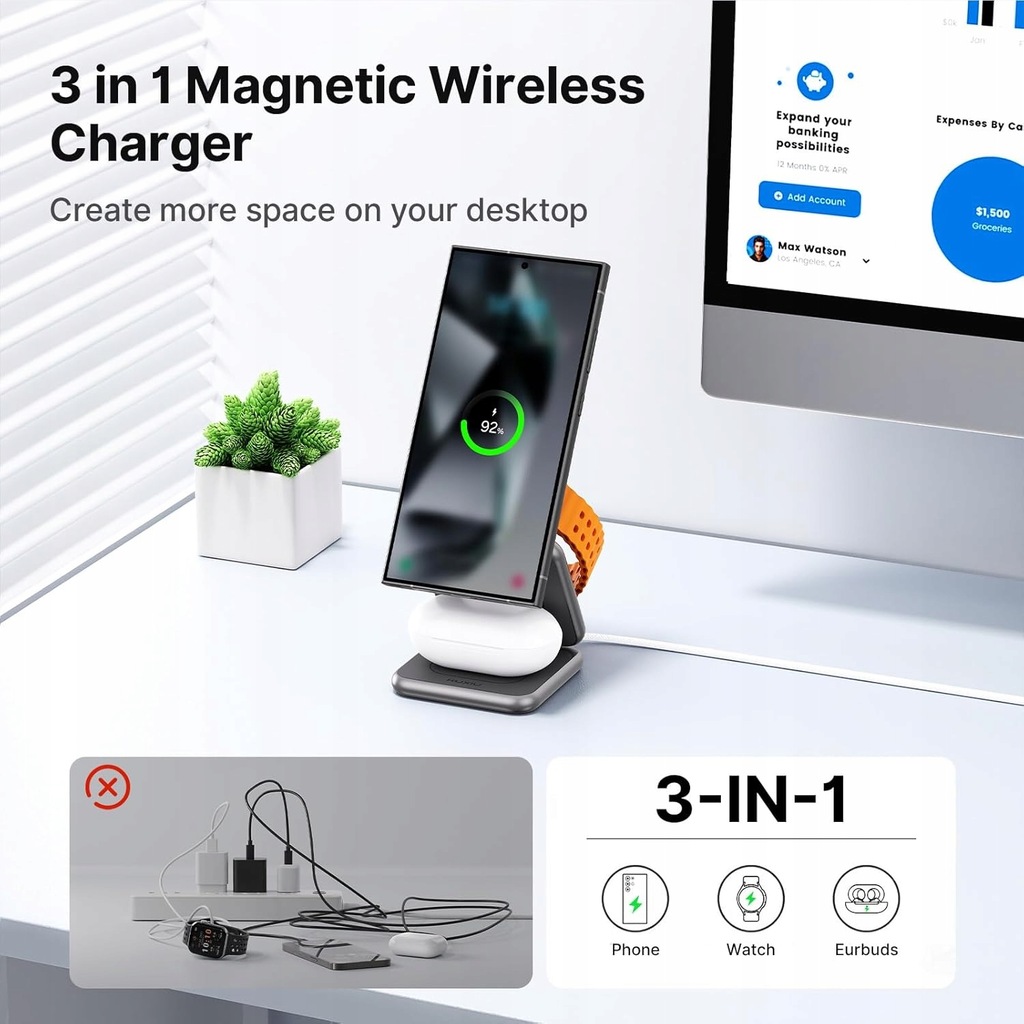 Uniwersalna i praktyczna ładowarka 3w1 stworzona specjalnie dla użytkowników Samsung. Umożliwia jednoczesne ładowanie telefonu Samsung, zegarka Galaxy Watch oraz słuchawek Galaxy Buds. Składana konstrukcja pozwala na ładowanie w poziomie lub pionie, bez plątaniny kabli – porządek na biurku gwarantowany.