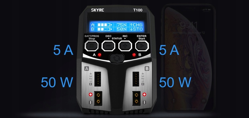 Ładowarka SkyRC T100 to dwukanałowa ładowarka, która jest w stanie naładować lub rozładować wszystkie najpopularniejsze typy akumulatorów. Przemyślana konstrukcja pozwala na bezproblemowe podłączenie do portów balansera i wtyczki XT60. Ładowarka jest niewielka, ale posiada aż 100 watów mocy, które pozwalają na ładowanie akumulatora prądem 5 amperów. Ładowarka posada również tryby ładowania AGM i zimny do ładowania akumulatorów kwasowo-ołowiowych i AGM w niższych temperaturach.