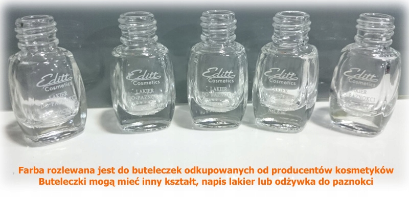 Lakier rozlewamy do buteleczek do lakieru lub odżywki do paznokci. Buteleczki są znacznie lepszym rozwiązaniem od małych pojemniczków na farby ponieważ farba nie wysycha i od razu mamy pędzelek do malowania. Zdarza się, ze dana partia ma nadruk "lakier do paznokci". Prosimy się tym nie sugerować i absolutnie nie używać do malowania paznokci ponieważ wystąpią problemy z jego usunięciem.