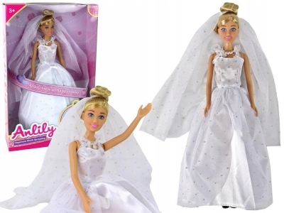 Lalka Anlily Panna Młoda Biała Suknia Ślub Lalka Anlily Panna Młoda to urocza zabawka, która zachwyca swoim eleganckim wyglądem i szczegółami. Jej główną cechą charakterystyczną jest przepiękny kok z włosów, który został starannie uczesany i ozdobiony długim, błyszczącym welonem. To welon sprawia, że lalka prezentuje się jak prawdziwa panna młoda, gotowa do swojego wielkiego dnia.Makijaż lalki Anlily jest bardzo starannie wykonany. Jej oczy są pomalowane, co nadaje im wyrazistości i delikatności, a usta mają subtelny kolor, który dodaje uroku całemu wyglądowi lalki. Szyję lalki zdobi piękny duży biały naszyjnik, który dodaje elegancji i przypomina biżuterię ślubną.Sama suknia, którą nosi lalka Anlily, jest prawdziwym arcydziełem. To długa, błyszcząca suknia ślubna, która wspaniale się prezentuje. Suknia ma wiele błyszczących elementów, co sprawia, że lalka wydaje się jak prawdziwa księżniczka. Jej nóżki ozdabiają czarne, wysokie, eleganckie buty, które doskonale komponują się z całą stylizacją.Lalka Anlily Panna Młoda to nie tylko zabawka, ale także piękna ozdoba, która może stać się elementem dekoracyjnym w pokoju dziecka lub kolekcjonerskim skarbem dla miłośników lalek. Jej szczegółowo wykonane ubranie i dodatki sprawiają, że jest ona niezwykle atrakcyjna i zachwycająca dla wszystkich, którzy ją zobaczą.Zawartość zestawu :- lalka Anlily panna młoda- oryginalne opakowanieWymiary lalki :31 cm x 6 cmWymiary opakowania :20 cm x 32 cm x 7 cmPosiada certyfikat CE, ponadto jest zgodny z normą EN71. Zabawka przeznaczona jest dla dzieci powyżej 3 roku życia.