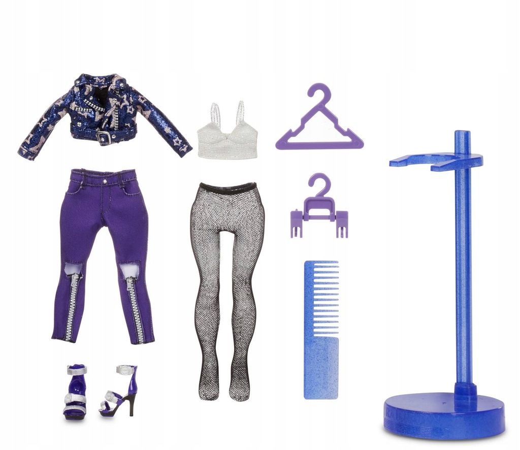- ZAWIERA - Lalke modowa, 2 kompletne stroje, 2 pary butów, szczotke do wlosów, 2 wieszaki i stojak na lalke.
