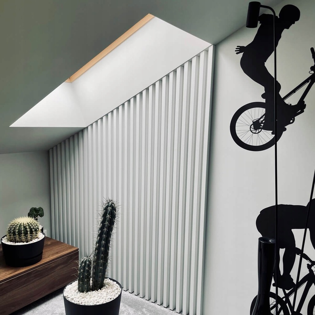 Dekoracyjne pionowe lamele na ścianę w kolorze Beton / Loft to idealne rozwiązanie do dekoracji zarówno ściany jak i sufitu. Nasze lamele możesz wykorzystać jako dekorację ściany, sufitu lub do zbudowania ścianki ażurowej.