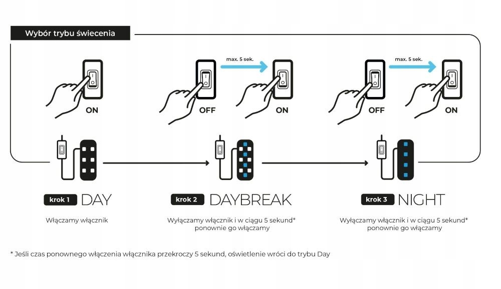 Oświetlenie Day & Night pięknie wyeksponuje aranżację w akwarium zarówno w dzień, jak i w nocy, a także sprawi, że wnętrze pomieszczenia w którym znajduje się zbiornik będzie bardziej przytulne. Zmiana trybu pracy DAY/ DAYBREAK / NIGHT następuje po wyłączeniu i włączeniu modułu przełącznikiem w czasie nie dłuższym niż 5 sekund. Przełączenie bezpośrednio w tryb DAY odbywa się po wyłączeniu modułu na okres dłuższy niż 5 sekund i jego ponownym włączeniu.