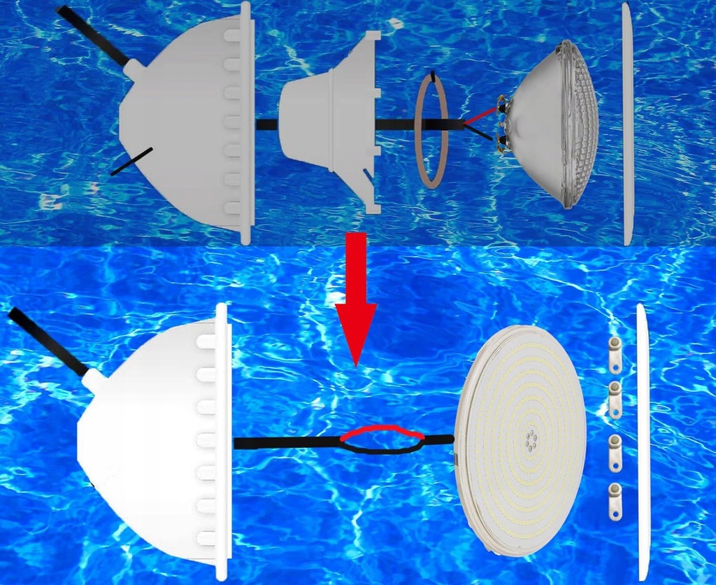 Łatwa wymiana – Kompatybilne z większością opraw/nisz PAR56 (z wyjątkiem małych lamp do spa), idealne do zastąpienia 300W żarówek halogenowych. Dzięki ochronie IPX8, są odporne na korozję spowodowaną środkami chemicznymi do uzdatniania wody basenowej i w pełni kompatybilne z chlorowaniem solnym.