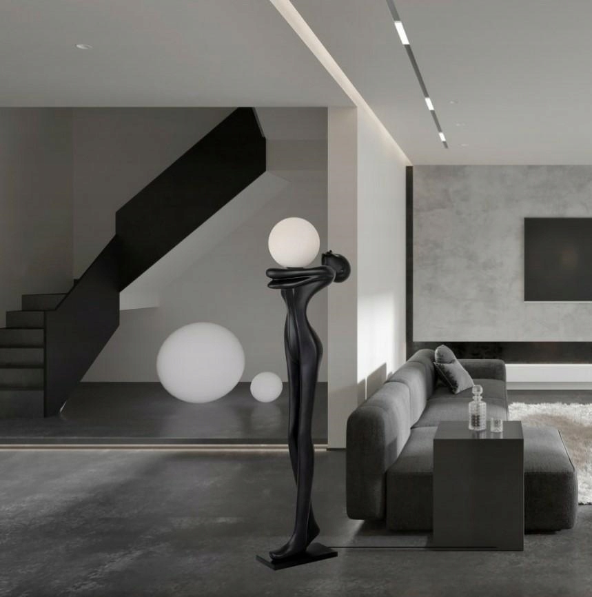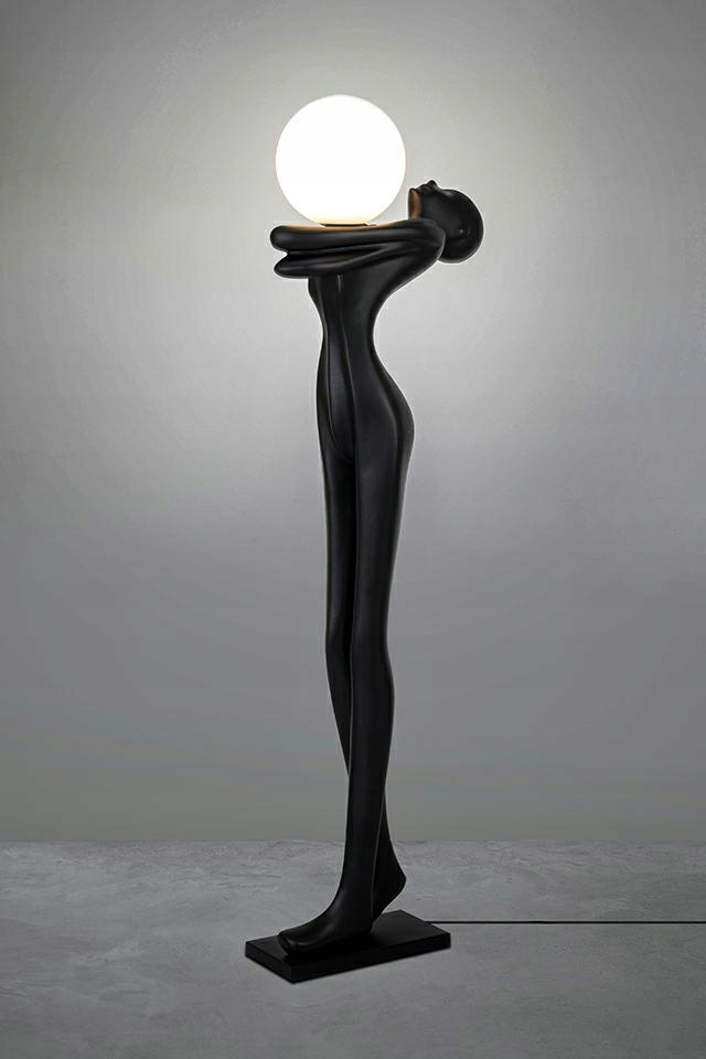 Lampa wykonana jest z niezniszczalnego włókna szklanego, w kolorze czarnym oraz jednego szklanego w kolorze białym klosza o średnicy FI 25 cm. Stworzony kontrast kolorystyczny idealnie współgra z jej oryginalną formą lampy, w postaci sylwetki kobiety, obejmującej przed sobą kulę oświetleniową. Na kloszu mogą wystąpić pęcherzyki powietrza, które są naturalnym efektem ręcznej obróbki szkła.