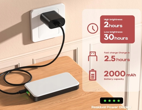 Wbudowana bateria 2000mAh może być używana do 2 godzin na najwyższym poziomie jasności.