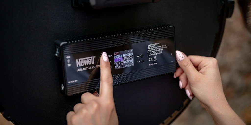 Lampa LED Newell Air Artha XL w wariancie RGB RC APP to zupełnie nowe możliwości eksperymentowania ze światłem. Lampa oferuje 360 różnych barw dostępnych w obrębie przestrzeni HSI. Dla każdego z kolorów możesz też ustawić określoną jasność i saturację w zakresie od 0 do 100. Mnogość kombinacji ustawień to niezastąpione wsparcie w przekształcaniu artystycznych wizji w efektowne zdjęcia i materiały video.