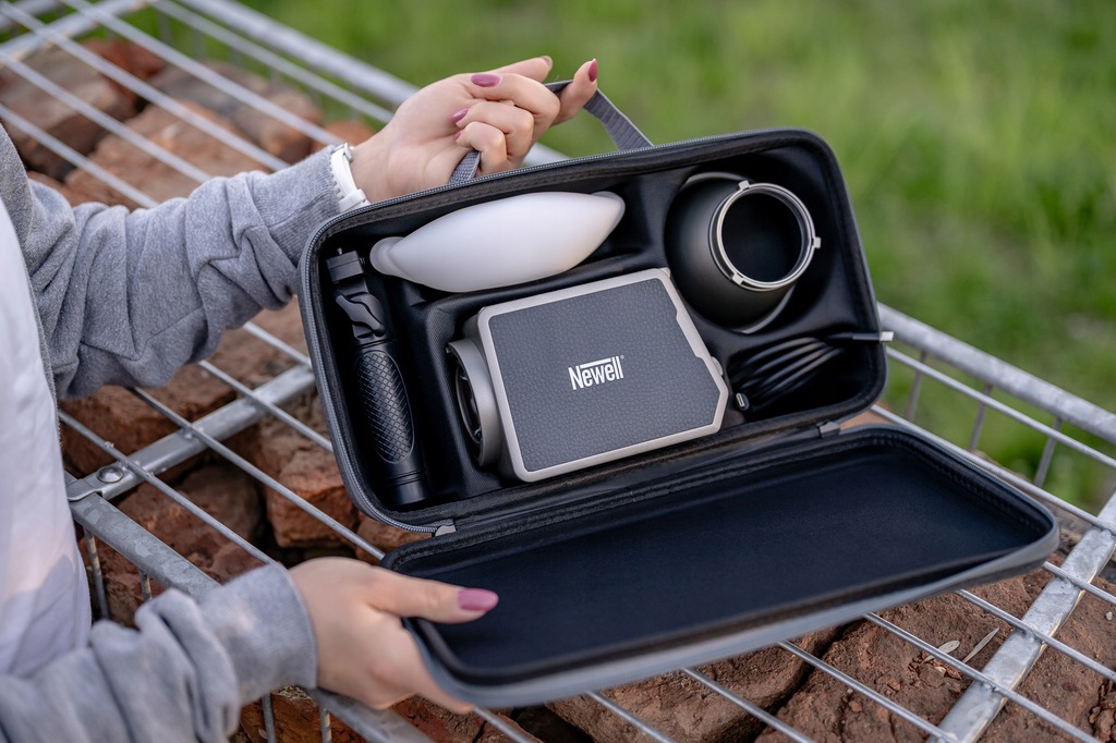 Newell Zora 90 WB to prawdziwa rewolucja, jeśli chodzi o kompromis między wymiarami a funkcjonalnością. Urządzenie skutecznie łączy dużą moc z wbudowanym akumulatorem, kompaktową konstrukcją i profesjonalnymi możliwościami sterowania. Przy wymiarach zaledwie 15 x 8,5 x 10 cm oferuje parametry, które były dotąd zarezerwowane dla znacznie większych i cięższych lamp studyjnych. Dzięki temu może z powodzeniem konkurować z klasycznymi urządzeniami zasilanymi z sieci – i często przewyższa je swoimi możliwościami, oferując mobilność, szybką adaptację do potrzeb i gotowość do pracy w każdych warunkach. To idealne narzędzie dla twórców, którzy nie chcą wybierać między jakością a wygodą.