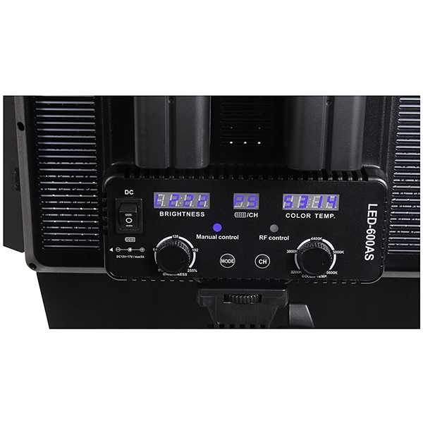 Podświetlany na niebiesko wyświetlacz LCD prezentuje ustawione wartości jasności, temperatury barwowej, pozostałej pojemności baterii i kanału z którego korzysta pilot. Naszą lampą studyjną można sterować bezpośrednio za pomocą jednostki sterującej lub pośrednio za pomocą pilota. Pilot umożliwia sterowanie kilkoma lampami studyjnymi poprzez odpowiednie ustawienie. Maksymalny zasięg to 50 metrów. Transmisja odbywa się w paśmie częstotliwości 2,4 GHz.