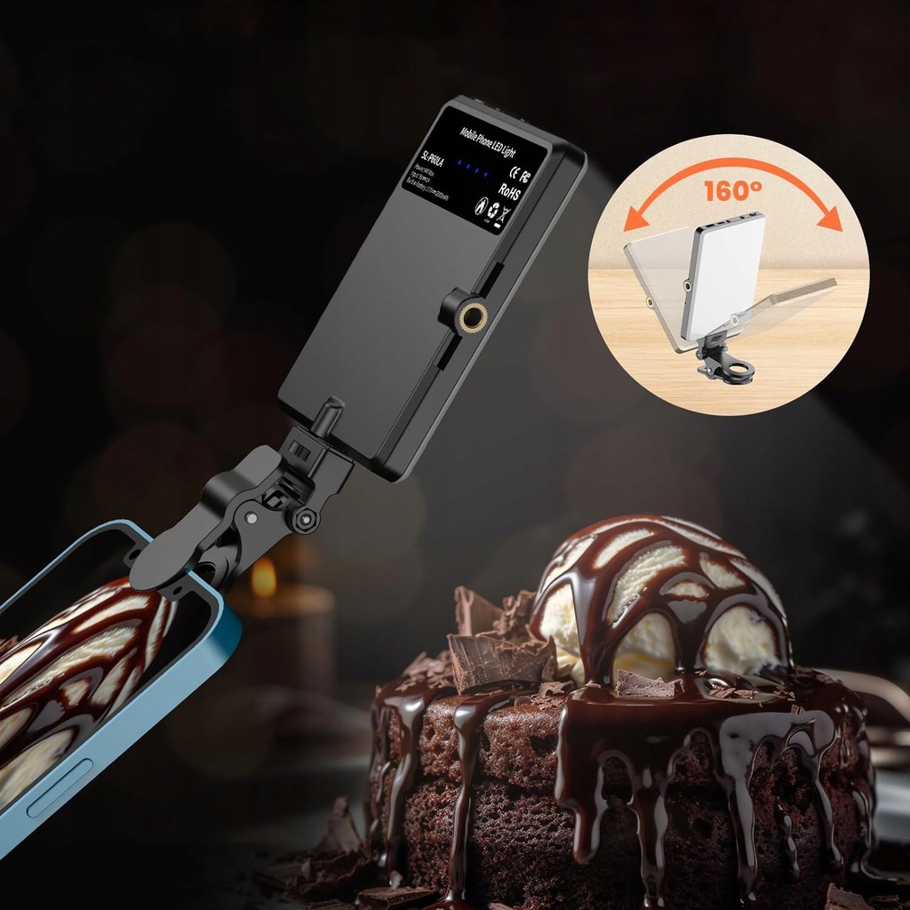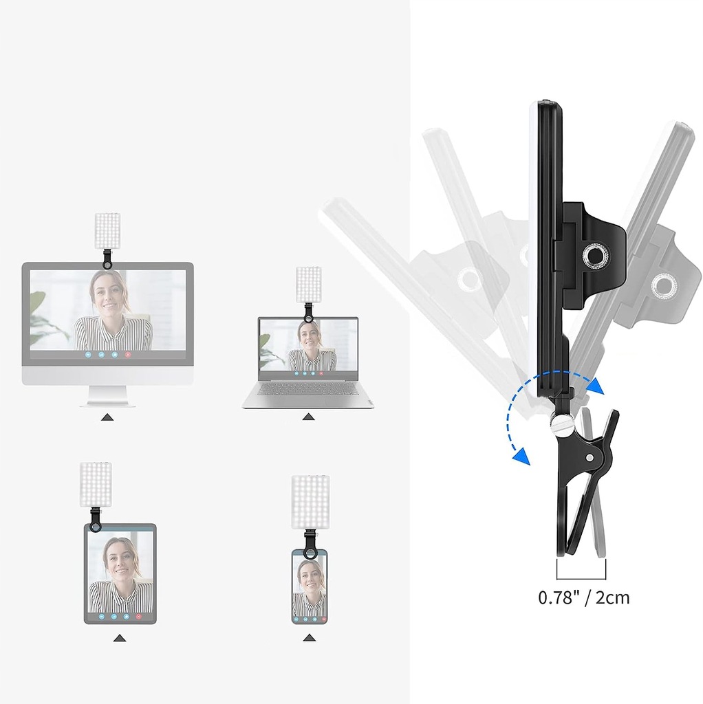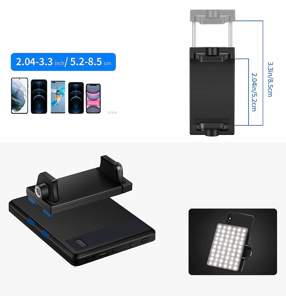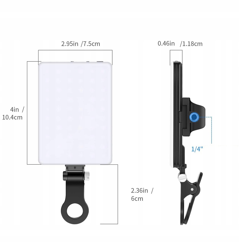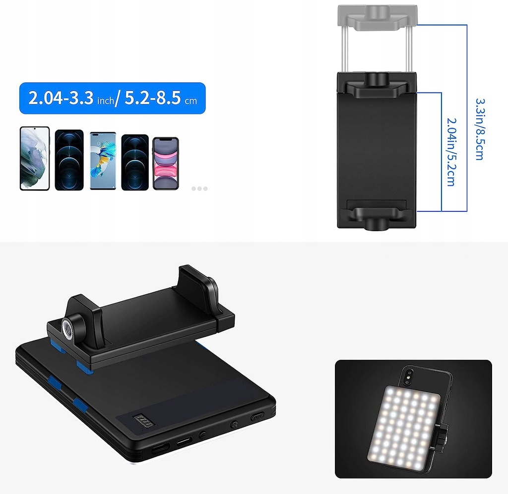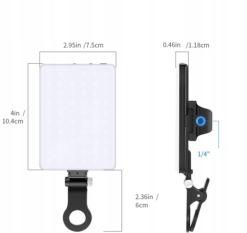 Okrągły klips umożliwia przymocowanie latarki do smartfona, tabletu lub laptopa o grubości do 20 mm, pozostawiając przednią kamerę odkrytą. Dwa mocowania 1/4 " otwory na śruby umożliwiają montaż lampy bezpośrednio na dowolnym statywie.