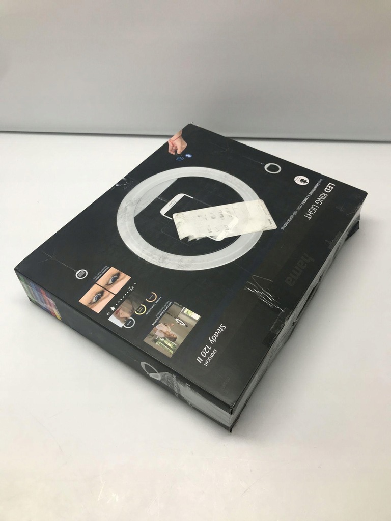 Regulowana lampa pierścieniowa na statywie ze 160 diodami LED: regulacja temperatury barwowej w 3 poziomach od ciepłej bieli do jasnej jak światło dzienne, możliwość przyciemniania natężenia światła w 10 poziomach od jasnego do przyjemnie przyciemnionego