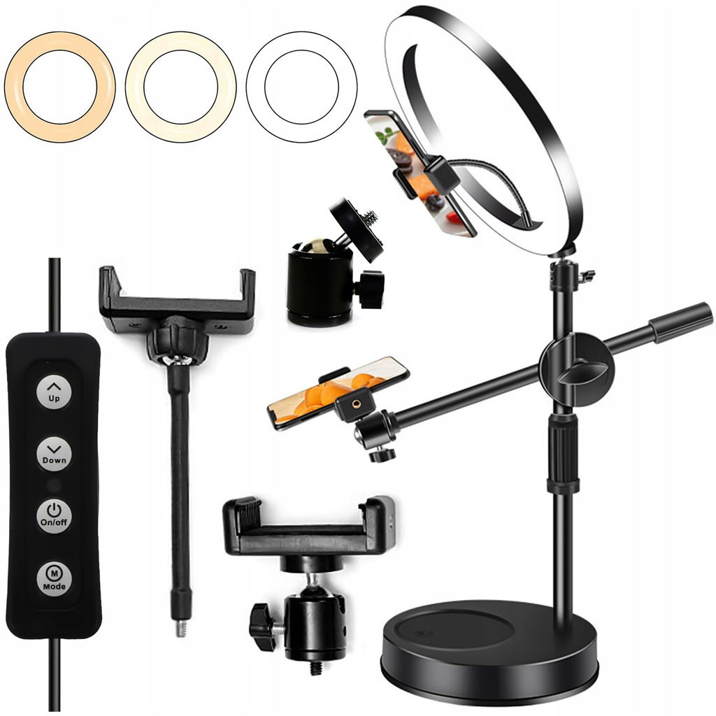 Lampa pierścieniowa LED ze statywem na biurko i uchwytami na telefon