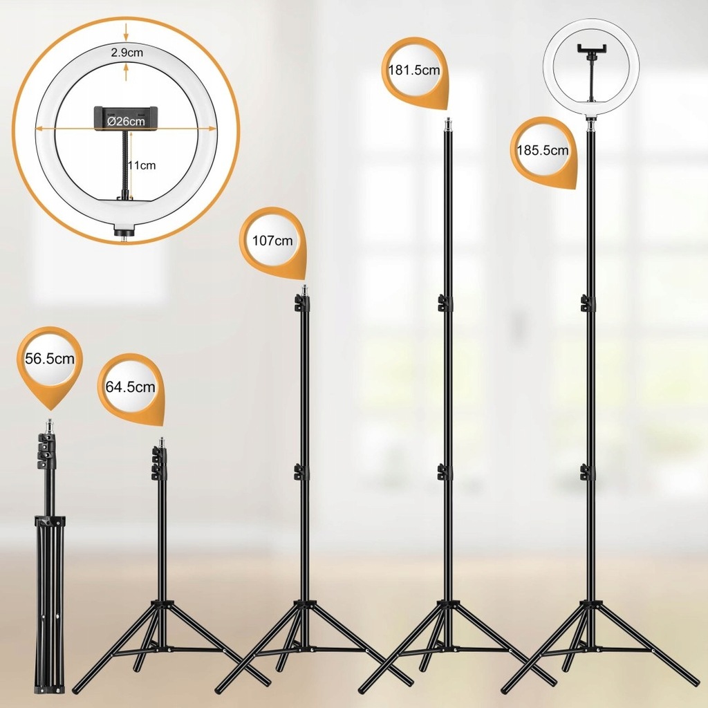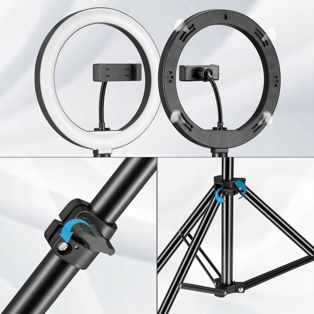 Cały zestaw obejmuje nie tylko lampę i statyw, ale także praktyczny uchwyt na telefon, co sprawia, że lampa pierścieniowa Rivoni staje się nieodzownym narzędziem dla twórców treści, fotografów i wizażystów.
