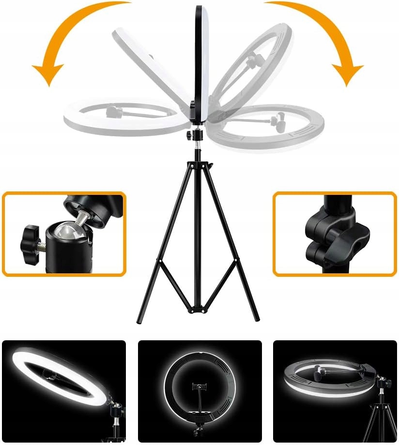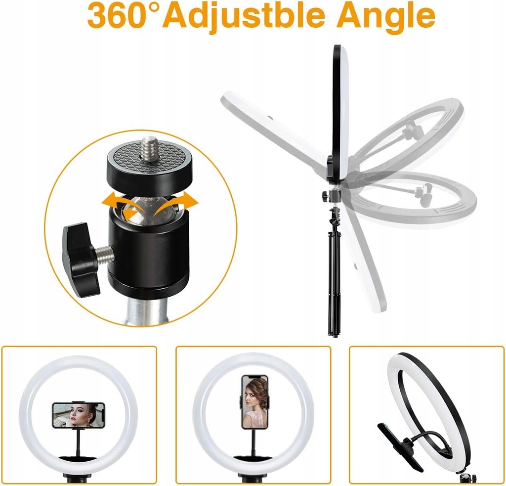 Obsługuje smartfony o szerokości od 2,2 do 3,4". Dzięki elastycznemu wężowi i obrotowej o 360° głowicy kulowej można łatwo ustawić uchwyt na telefon komórkowy i lampkę pierścieniową, aby znaleźć żądany kąt.