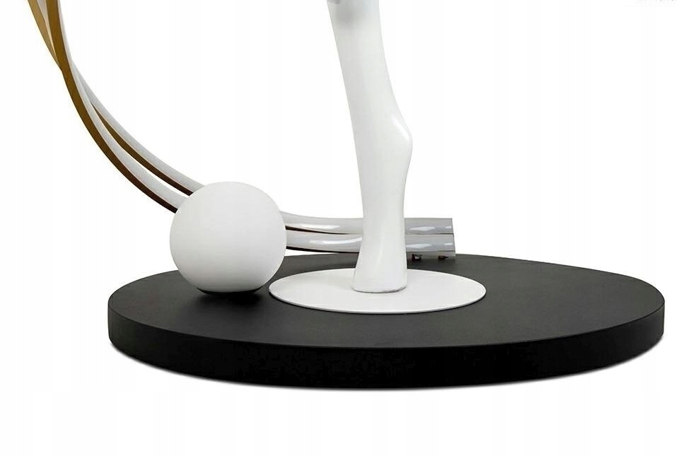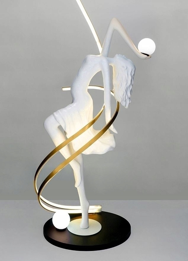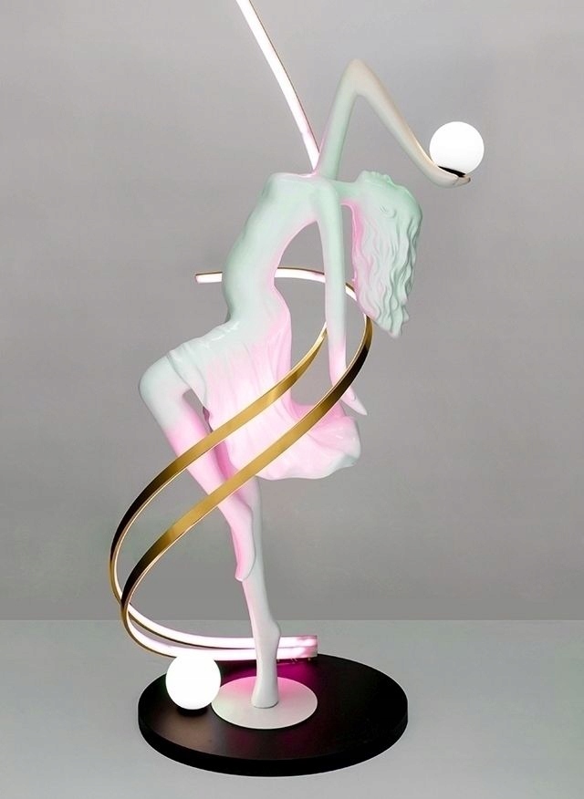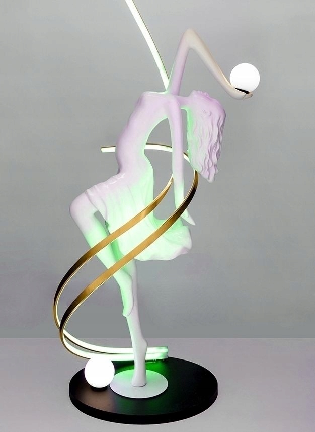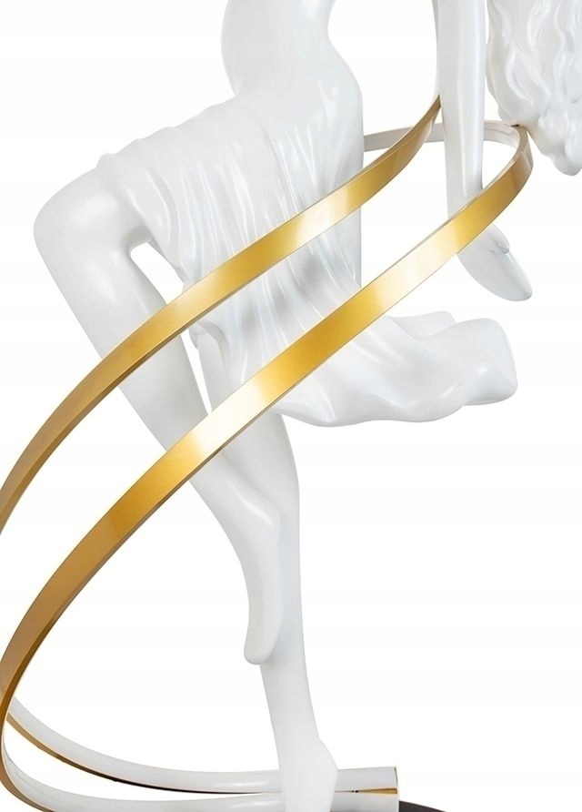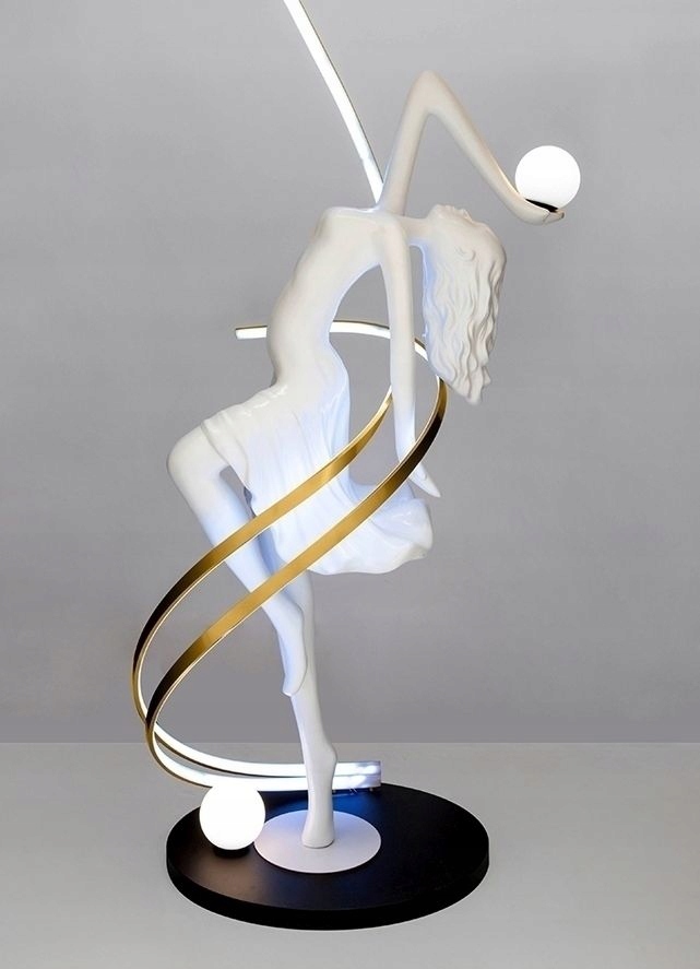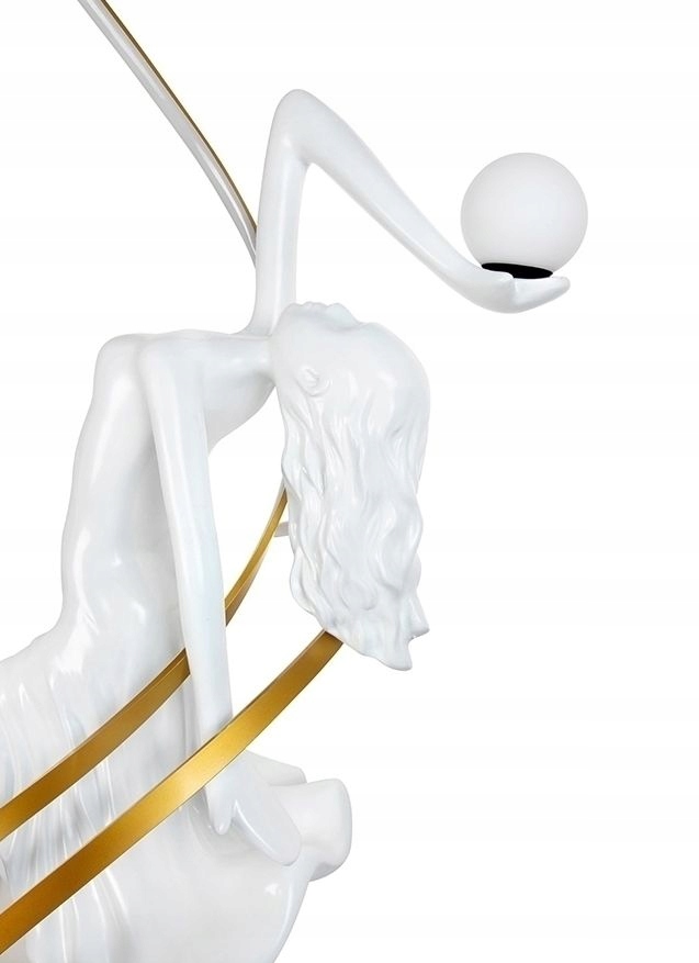 Oryginalna i efektowna forma lampy przybrała sylwetkę tańczącej kobiety, wykonanej z niezniszczalnego włókna szklanego, w kolorze białym, która umieszczona została na metalowej podstawie. Okrągłe klosze lampy, jeden umieszczony w dłoni kobiety, drugi u podstawy są ze szkła mlecznego. Całą konstrukcję dopełnia ledowe źródło światła w złotym kolorze, sprytnie i efektownie oplatające postać kobiety.